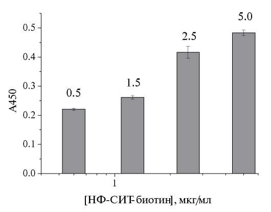 Выбор концентрации конъюгата НФ-СИТ-биотин проводили при ее варьировании от 5 до 0.6 мкг/мл. Критерием выбора было достижение наиболее высокого значения оптической плотности; была выбрана концентрация конъюгата 5 мкг/мл (рис. 6).