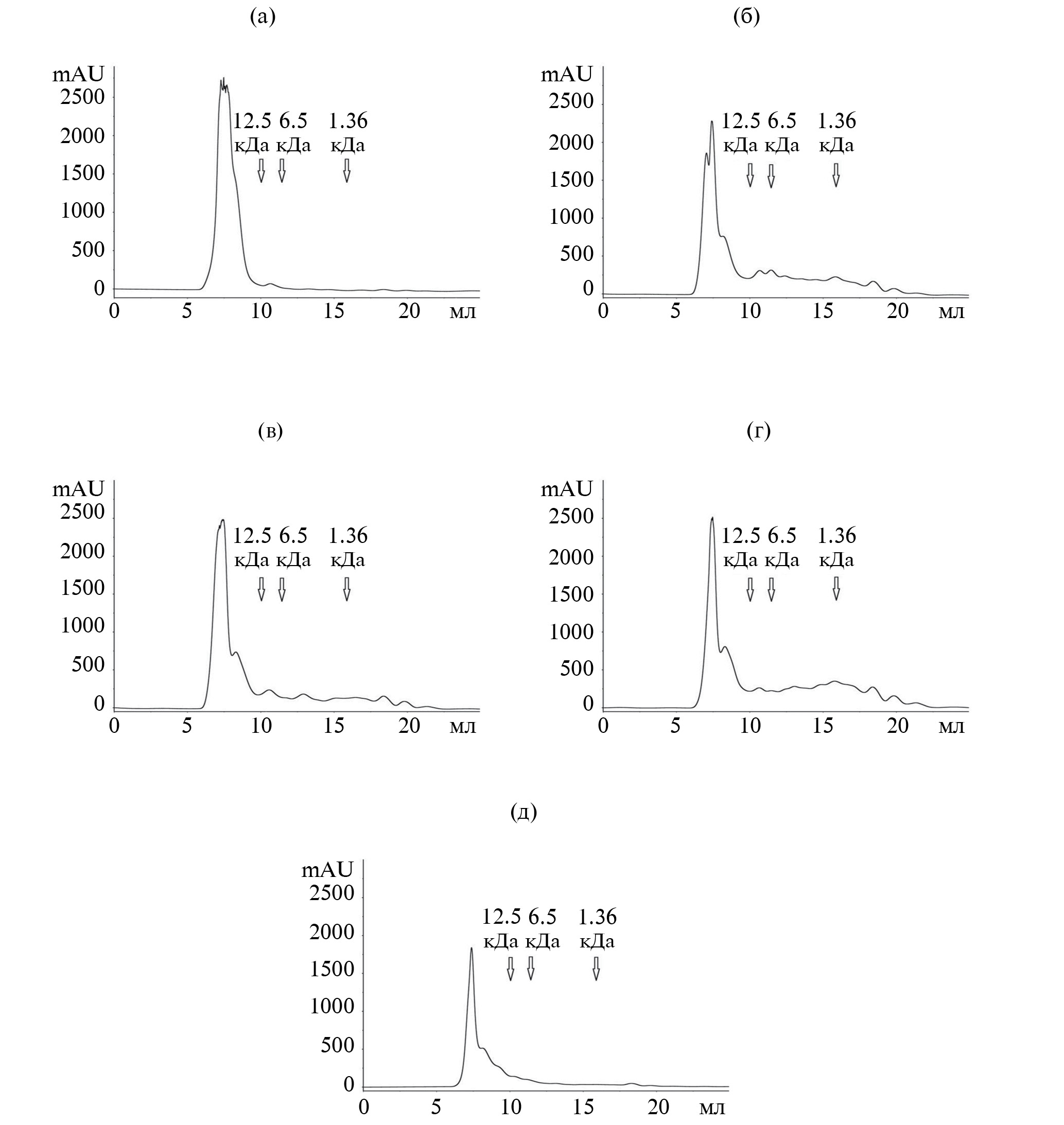 Рис. 2. Хроматография необработанного изолята горохового белка (а), а также изолятов, обработанных препаратами БНП (б), ГКП (в), БЩП (г) и ГЩП (д), на колонке SuperdexPeptide 10/300 Gl.