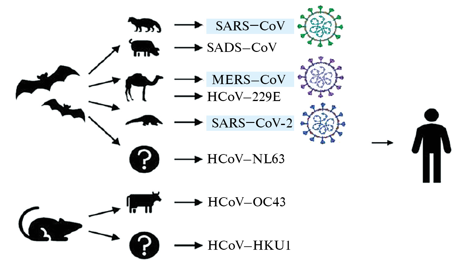 Рис. 1. Происхождение коронавирусов человека (коронавирус тяжелого острого респираторного синдрома (SARS-CoV), коронавирус тяжелого острого респираторного синдрома 2 (SARS-CoV-2), коронавирус ближневосточного респираторного синдрома (MERS-CoV), коронавирус человека (HCoV), коронавирус синдрома острой диареи свиней (SADS-CoV) [4].