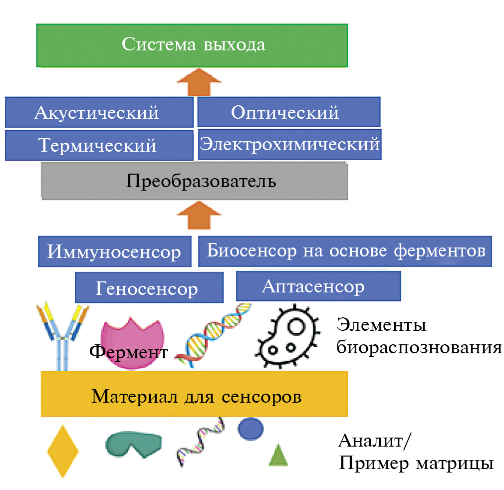 Основные принципы действия биосенсоров. Для определения вирусных частиц применяются биосенсоры, обладающие различной конструкцией и механизмом действия. Биосенсоры – био-химико-физические системы, состоящие из двух компонентов: чувствительного биологического элемента (биорецептора) и системы детекции (физический преобразователь), которые позволяют регистрировать концентрацию или активность различных аналитов, присутствующих в образце [16]. Биосенсоры классифицируются в зависимости от вида биорецептора (ферменты, микроорганизмы, бактериофаги, ДНК, антитела, ткани, органеллы и хеморецепторы и др.) и типа датчика (оптические, амперометрические, потенциометрические, полупроводниковые, термометрические, фотометрические и пьезоэлектрические) [34, 35]. Биосенсоры позволяют значительно уменьшить время проведения анализа, благодаря относительной простоте проведения процедур, и, как показывают литературные данные, являются довольно чувствительными и требуют минимальной предварительной обработки исследуемого материала. Общая схема биосенсора представлена на рис. 2 [15].