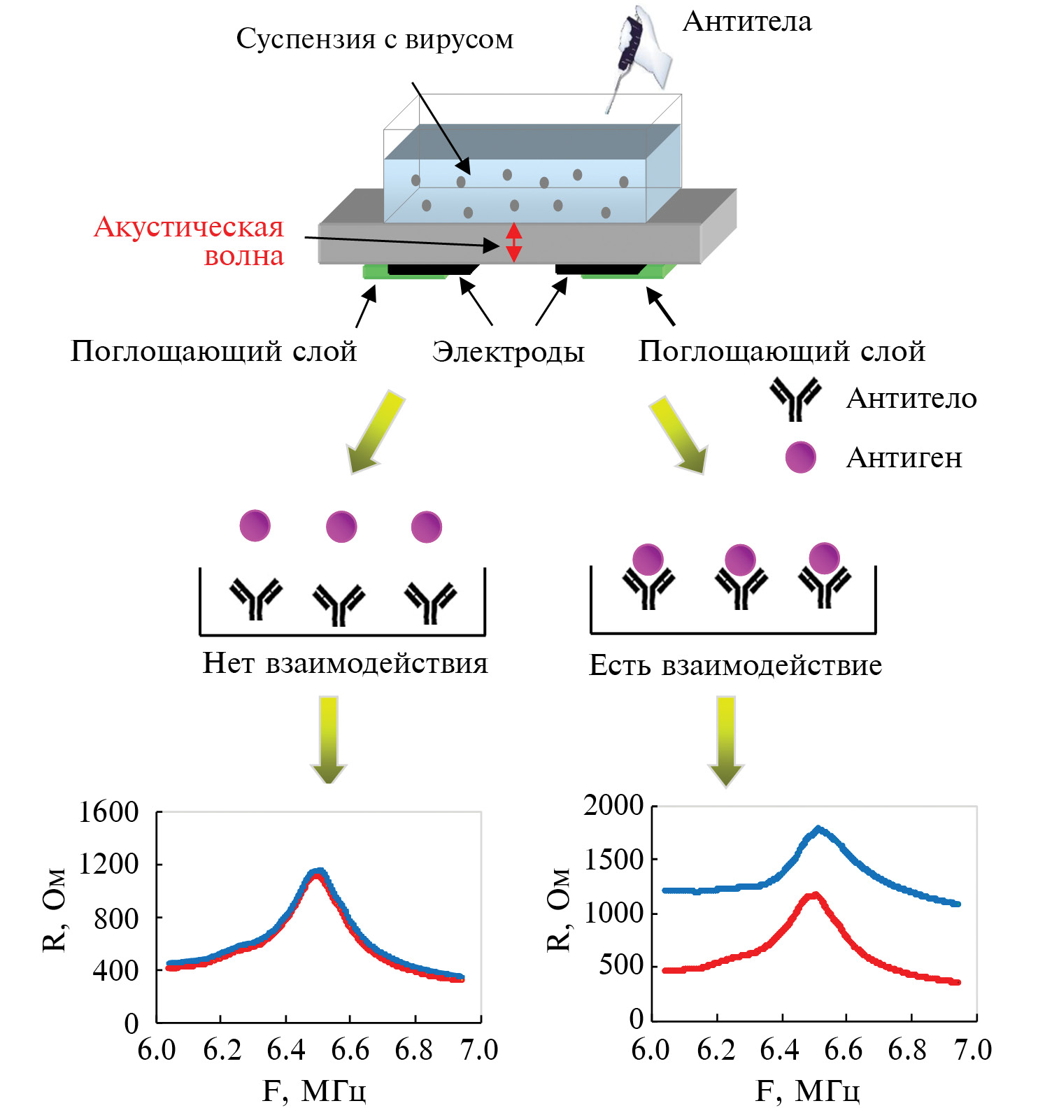 Принцип действия электроакустических методов анализа вирусов основан на регистрации протекания биоспецифической реакции в анализируемой суспензии или на поверхности слоя, содержащего иммобилизованный специфичный агент, контактирующий с поверхностью пьезоэлектрического звукопровода, по которому распространяется пьезоактивная акустическая волна. Изменения параметров анализируемого биологического объекта на поверхности акустического звукопровода приводит к изменению скорости акустической волны, что, в свою очередь, приводит к изменению измеряемых характеристик акустического датчика (электрический импеданс, частота, вносимые потери, фаза выходного сигнала) [16].