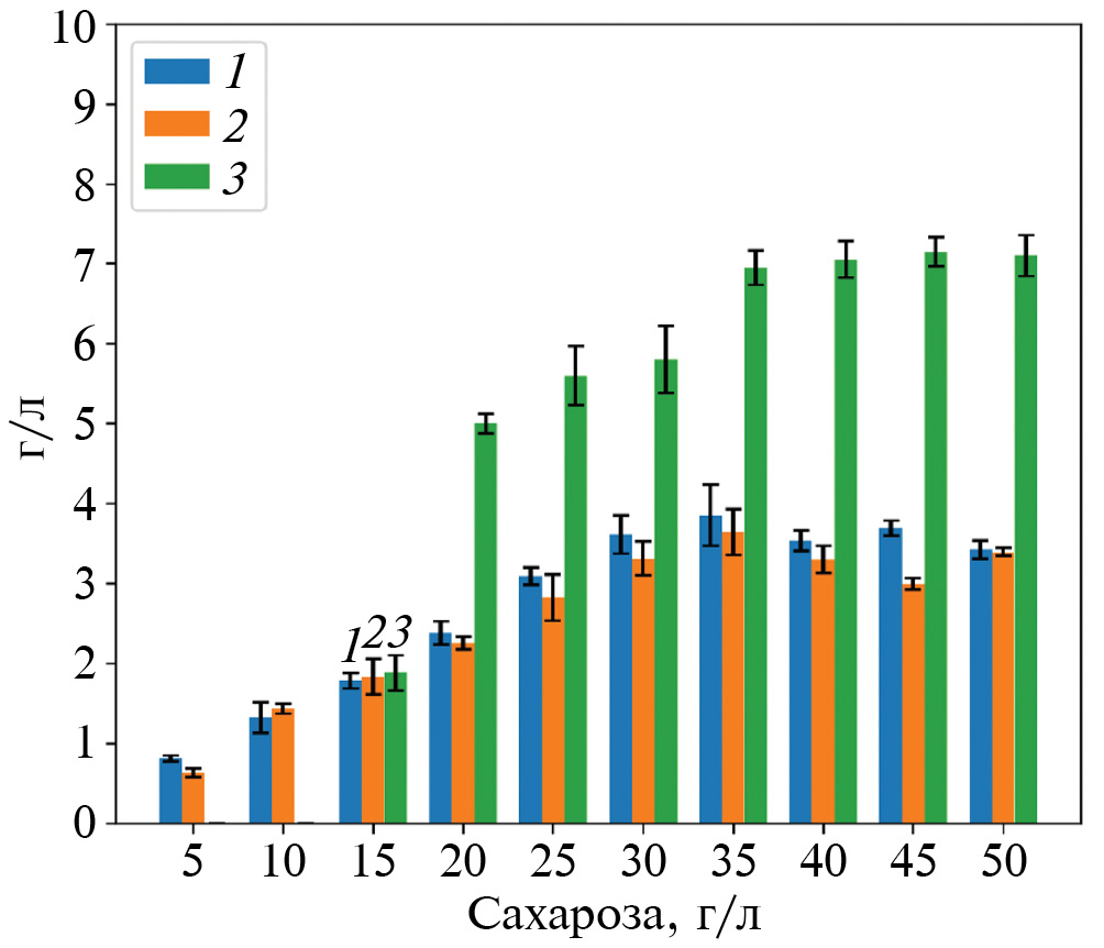 Рис. 1. Рост бактериального штамма A. vinelandii 12 при разных уровнях аэрации и концентрации сахарозы в среде от 5 г/л до 50 г/л (время ферментации – 72 ч: 1 – 150 об./мин; 2 – 200 об./мин; 3 – 250 об./мин. Множественное сравнение по Краскелу-Уоллису между всеми группами имеет уровень достоверности p < 0.05.