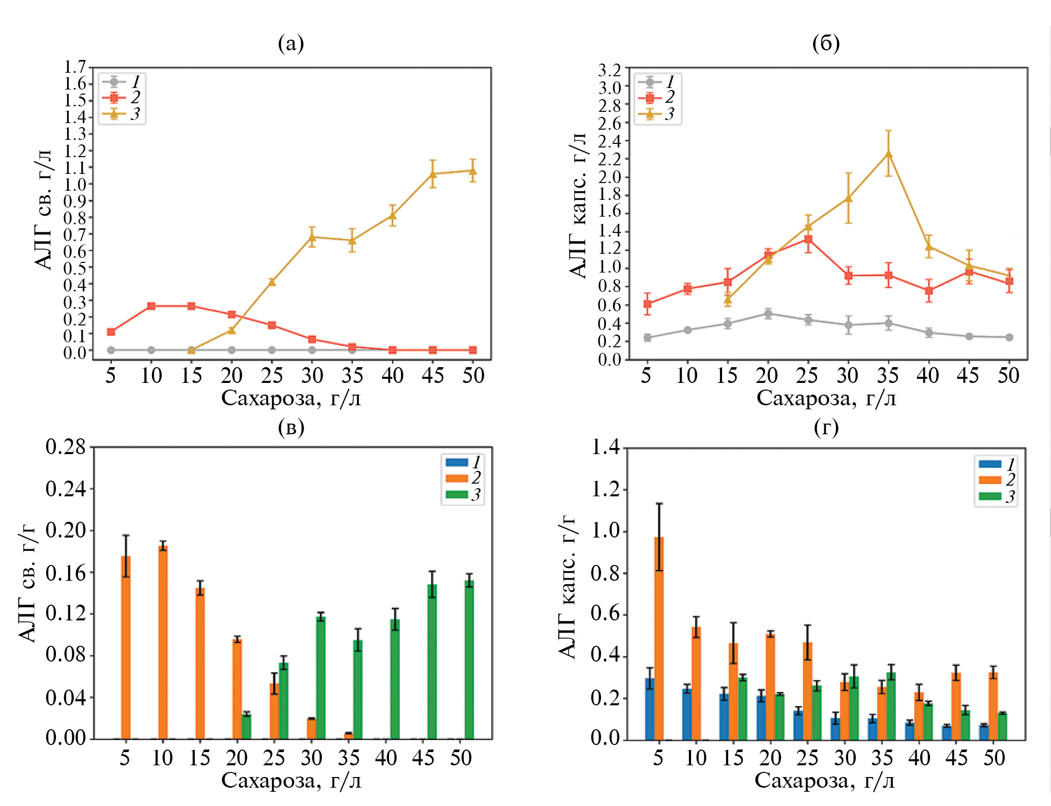 Сахароза, г/л | Свободный АЛГ (низкая аэрация), г/л | Свободный АЛГ (средняя аэрация), г/л | Свободный АЛГ (высокая аэрация), г/л | Капсулярный АЛГ (низкая аэрация), г/л | Капсулярный АЛГ (средняя аэрация), г/л | Капсулярный АЛГ (высокая аэрация), г/л |