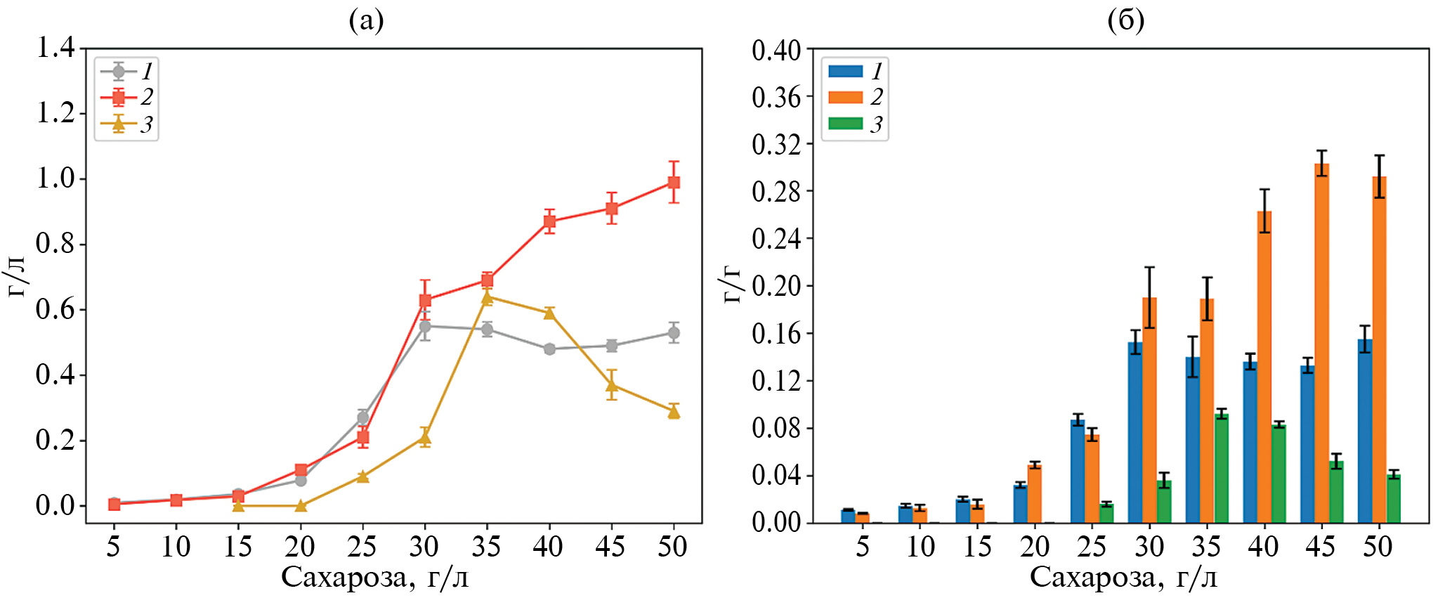 Рис. 3. Биосинтез (а, г/л) и продуктивность (б, г/г) ПОБ бактериальным штаммом A. vinelandii 12: 1 – 150 об./мин; 2 – 200 об./мин; 3 – 250 об./мин. Множественное сравнение по Краскелу-Уоллису между всеми группами имеет уровень достоверности p < 0.05.