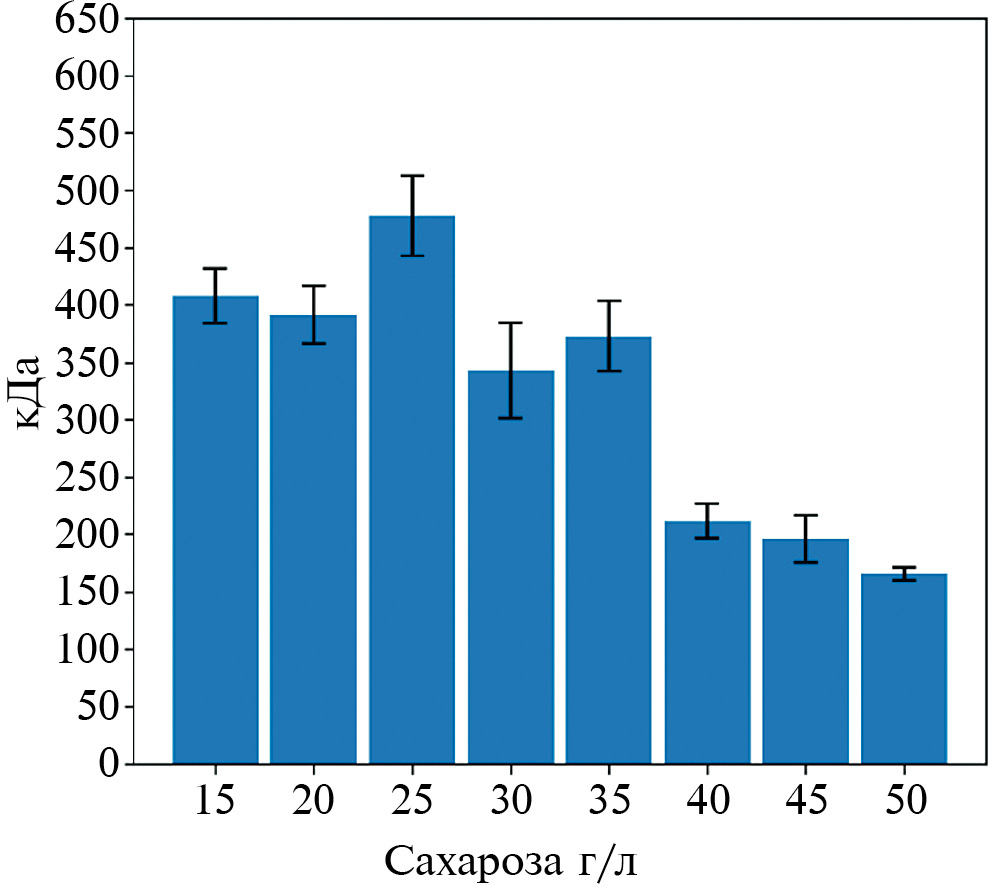 На рис. 4 можно отметить тенденцию снижения ММ капсулярных АЛГ при увеличении концентрации сахарозы в среде. Можно предположить, что клетки бактерий при избытке сахарозы начинают синтезировать ферменты гликозид-гидролазы и лиазы в широком диапазоне, в частности альгинат-лиазы, которые ответственны за расщепление АЛГ [31].