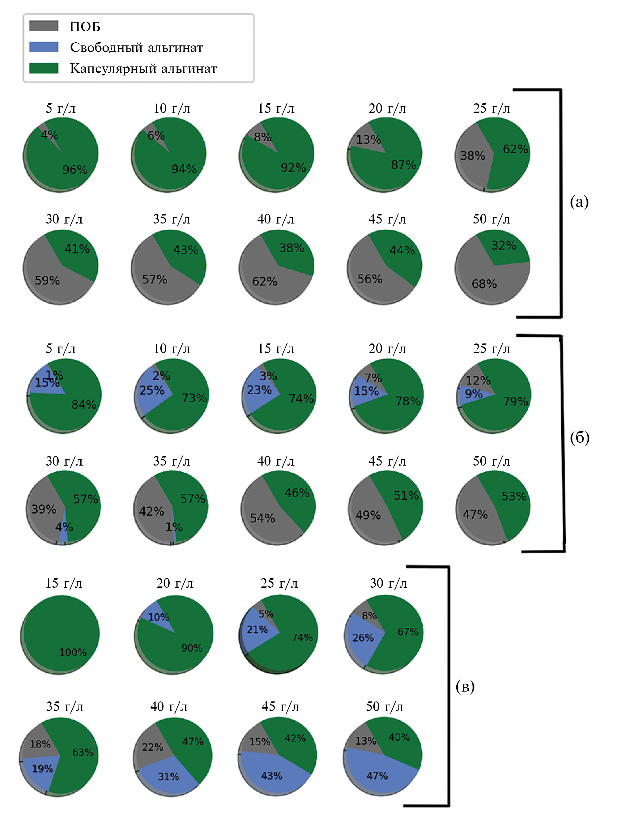 Изменение состава синтезированных биополимеров (свободных и капсулярных АЛГ и ПОБ) клетками A. vinelandii 12 в условиях изменения концентрации сахарозы в среде при разных уровнях аэрации. Основываясь на результатах по биосинтезу свободных и капсулярных АЛГ (рис. 2) и ПОБ (содержание полимеров в ферментационном объеме среды) (рис. 3) можно оценить процент каждого полимера от их общей суммы (круговые диаграммы, рис. 5). Результаты по составу синтезированных биополимеров клетками A. vinelandii 12 при низкой аэрации показали полное отсутствие синтеза низкомолекулярного свободного АЛГ при всех концентрациях сахарозы в ростовой среде (рис. 5а).