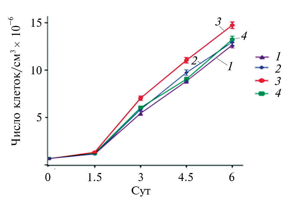 Рис. 1. Динамика роста культуры S. quadricauda в присутствии ацетилхолина (АХ) и без него. 1 – контроль; 2 – 1 мкМ АХ; 3 – 10 мкМ АХ; 4 – 100 мкМ АХ.