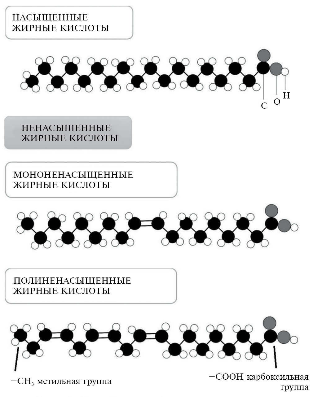 Жирные кислоты разделяют на три основных класса в зависимости от количества двойных связей в основной цепи атомов углерода. Выделяют насыщенные ЖК (НЖК), которые характеризуются отсутствием двойных связей в цепи, мононенасыщенные ЖК (МНЖК), имеющие одну двойную связь в цис-конфигурации и полиненасыщенные ЖК (ПНЖК), содержащие 2–6 двойных связей в цис-конфигурации [4], которые в природных ненасыщенных ЖК изолированы друг от друга или не сопряжены (то есть всегда отделены двумя простыми связями или одной метиленовой группой) (рис. 1).