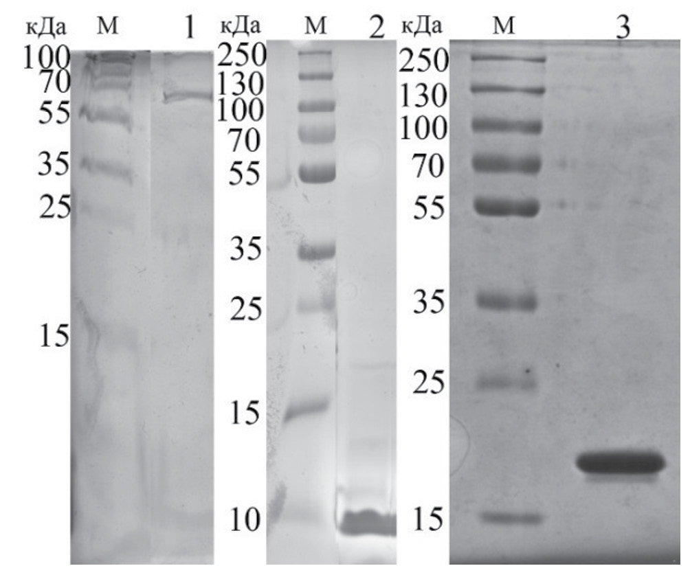 Идентичность последовательностей целевых белков подтверждена методами электрофореза в ПААГ (рис. 1) в денатурирующих условиях, масс-спектрометрией MALDI-TOF и тандемной масс-спектрометрией.