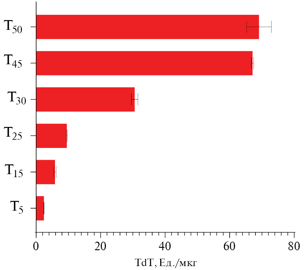 Условия реакции (время, концентрация фермента, олигонуклетида и TTP) и хроматографии (время и градиент) подбирали с учетом методики анализа, для оптимального разделения разных по длине исходных олигонуклеотидов. Исследование олигонуклеотидных субстратов T5–Т45 продемонстрировало, что активность TdT растет с увеличением протяженности олигонуклеотида (рис. 3). При длине субстрата в 45 и 50 нуклеотидов скорость уже не меняется. Эти данные согласуются с результатами, полученными ранее для серии гомополимерных олигонуклеотидов dAn (n = 4–50) [9].