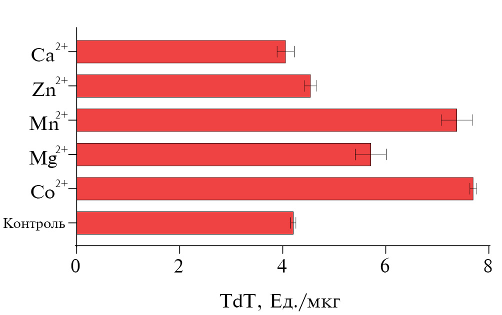 Для определения влияния катионов Me2+ на ферментативную активность TdT в реакционную смесь, содержащую 1.0 мМ Mg2+, дополнительно добавляли 0.25 мМ Me2+ (Ca2+, Zn2+, Mg2+, Mn2+, Co2+) в виде хлоридов. Наибольший эффект на активность TdT проявили катионы Co2+ и Mn2+, что не противоречит данным литературы (рис. 5) [30, 31]. Повышение концентрации Mg2+ увеличивало активность TdT на 35% (рис. 5). Незначительное увеличение активности фермента наблюдалось в присутствии катионов Zn2+, а добавление Ca2+ в пределах ошибки эксперимента не влияло на функционирование фермента.