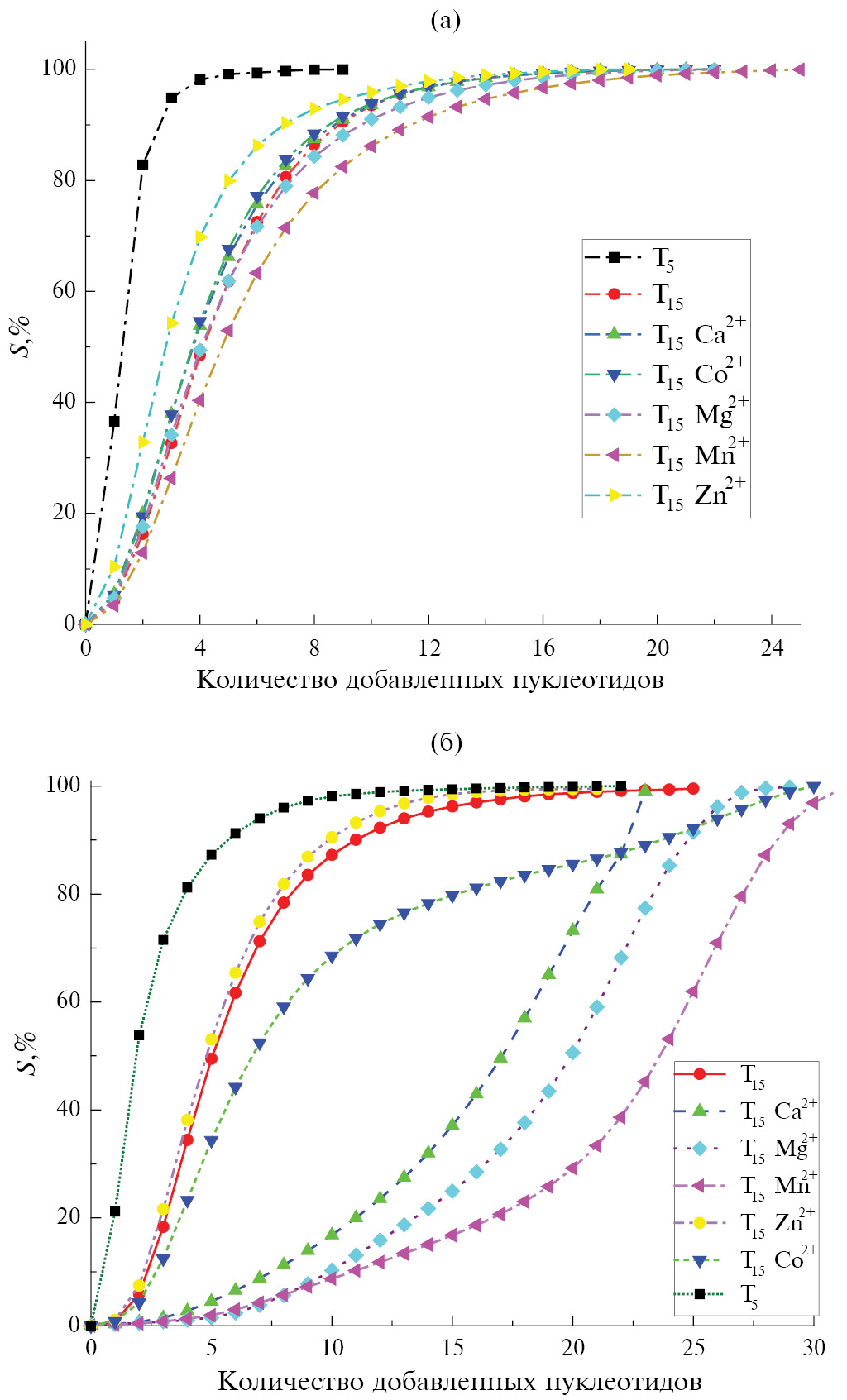 Рис. 6. Зависимость суммарной площади хроматографических пиков продуктов (S) от количества присоединенных TdT нуклеотидов к субстратам T5 и T15 в реакционной смеси, содержащей: 40 нМ TdT, 0.2 мМ TTP, 5 мM AcOK, 2 мM AcOTрис (pH 7.9), 1 мM AcOMg, 0.25 мМ Me2+ (обозначено на легенде для T15), 0.4 мкМ олигонуклеотида (а) и реакционной смеси, дополнительно содержащей 2 мкМ EcSSB (б).