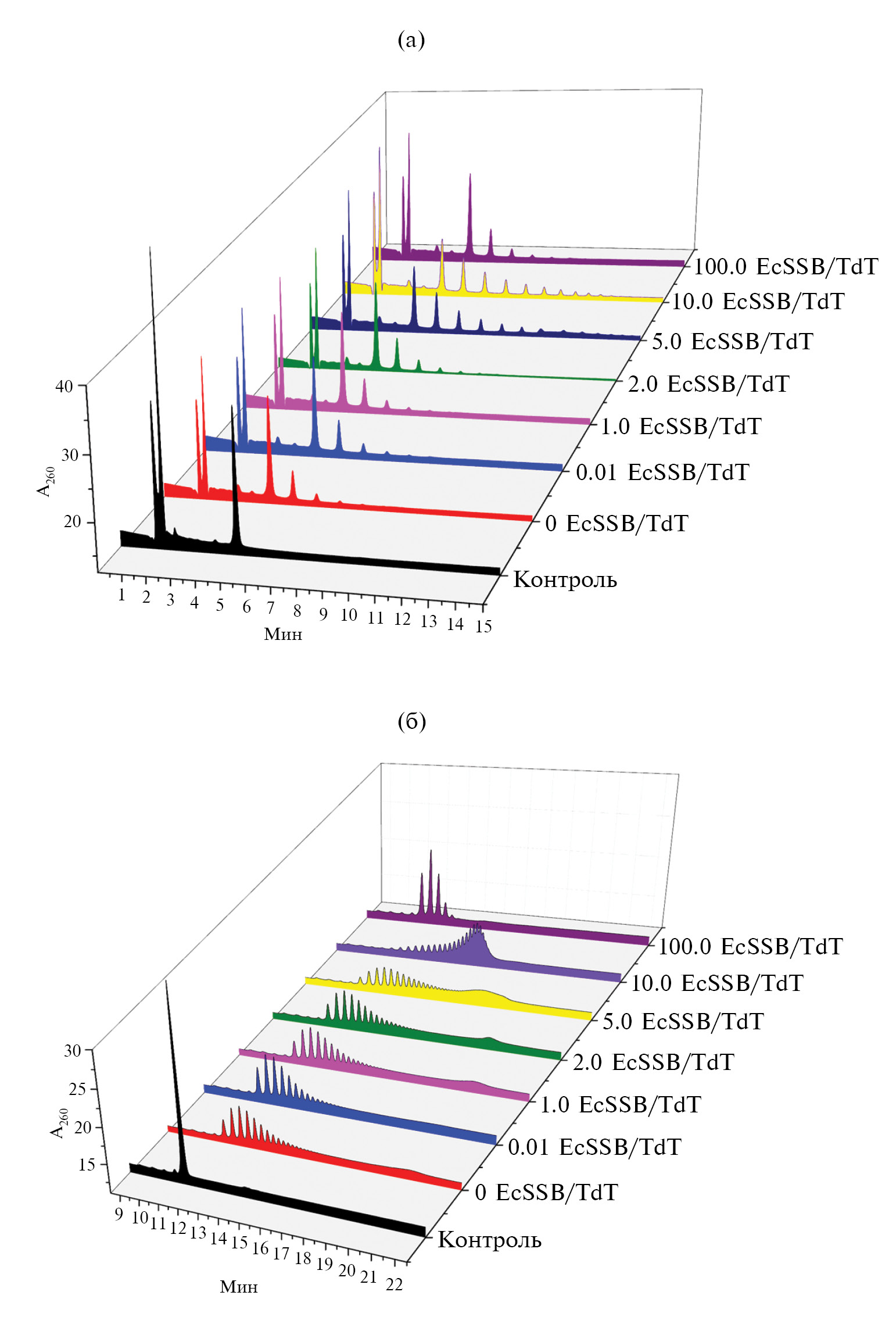 Рис. 7. Хроматограммы продуктов реакции при различных стехиометрических соотношениях EcSSB/TdT (субстрат T5, tR 5.6 мин, а) и EcSSB/TdT (субстрат T15, tR 12.4 мин, б); контроль: 0.2 мМ TTP, 5 мM AcOK, 2 мM AcOTрис (pH 7.9), 1 мM AcOMg и 0.4 мкМ олигонуклеотида Т5.