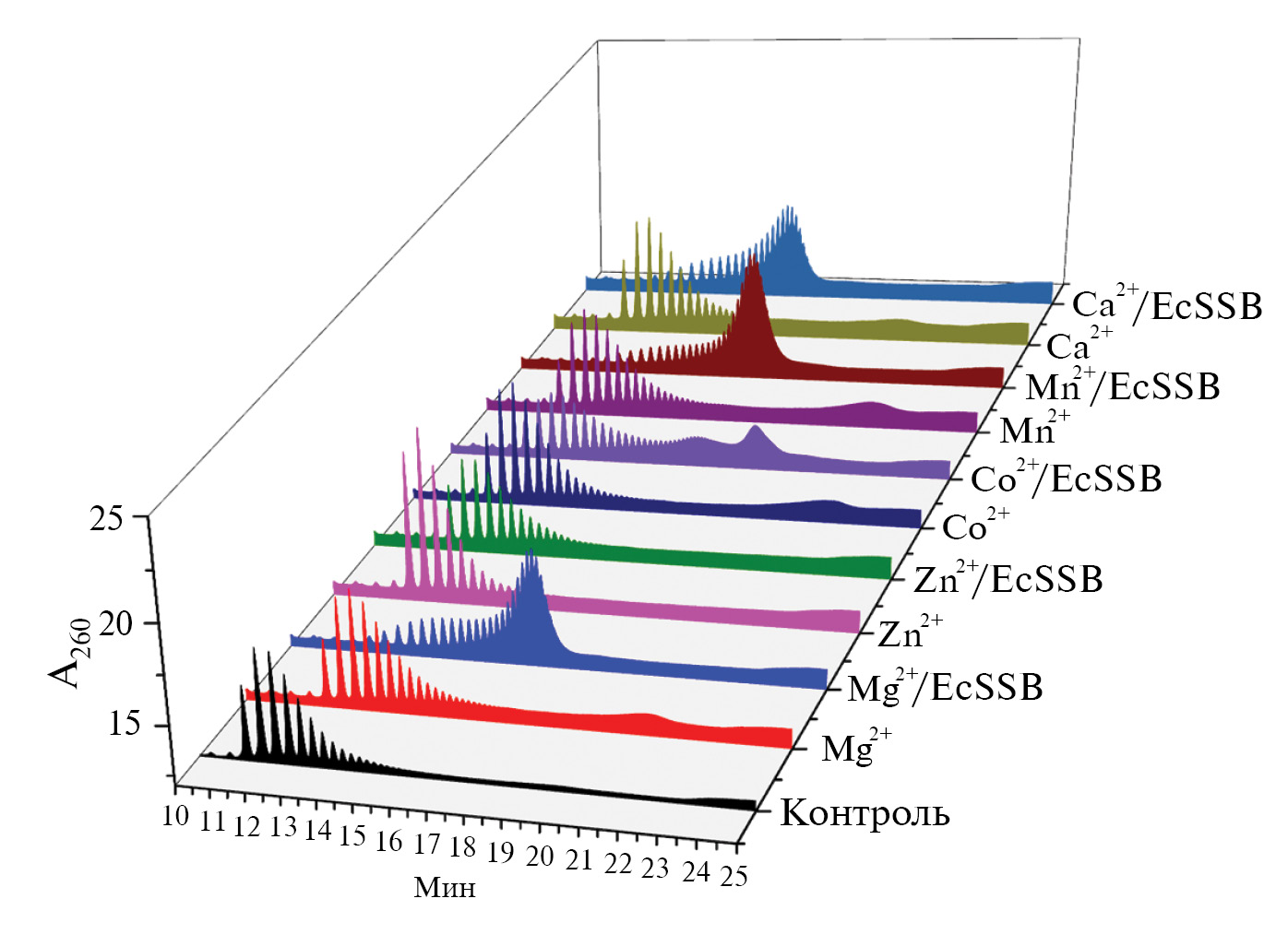 Рис. 10. Хроматограммы продуктов элонгации T15 (tR 12.4 мин), отражающие влияние катионов Me2+ и EcSSB: контроль: 40 нМ TdT, 0.2 мМ TTP, 5 мM AcOK, 2 мM AcOTрис (pH 7.9), 1 мM AcOMg, 0.25 мМ Me2+, 0.4 мкМ Т15 и 2 мкМ EcSSB.