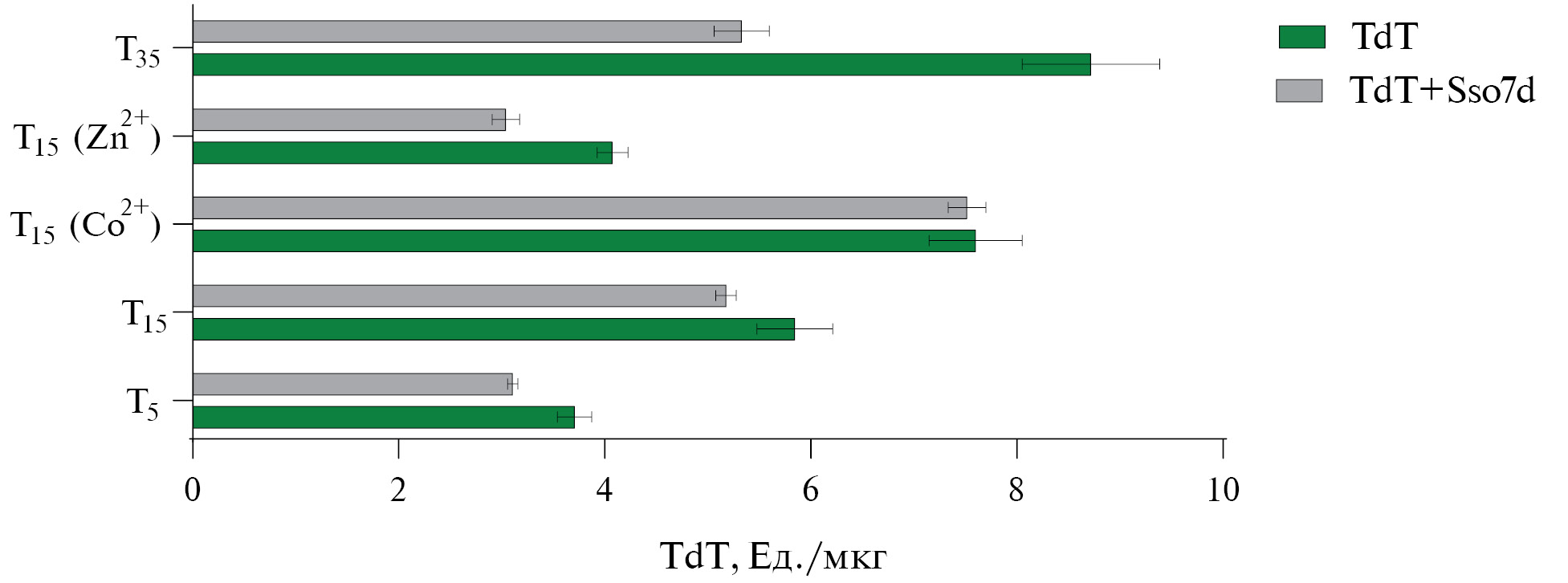 Рис. 11. Влияние Sso7d на активность TdT в реакции элонгации T5, T15, T35 в различных условиях. Отражено влияние катионов Zn2+ и Co2+ на элонгацию T15.