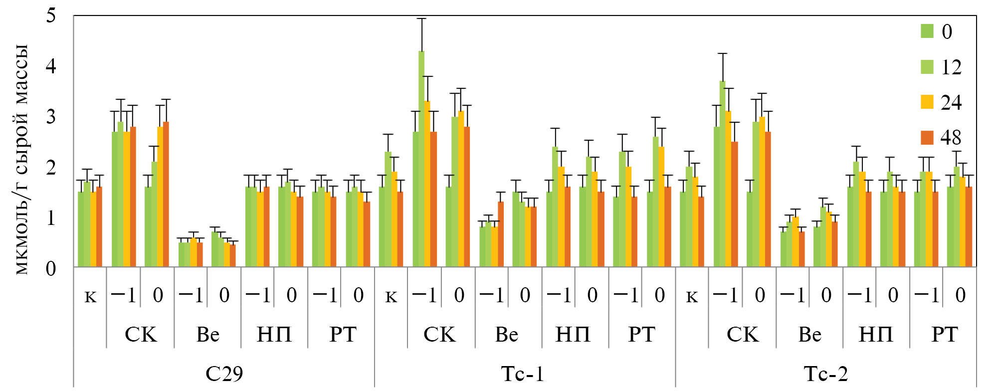 Рис. 1. Динамика изменения содержания супероксид-аниона O2•– в инфицированных P. graminis f. sp. tritici растениях восприимчивого сорта пшеницы и устойчивой линии при обработке фармакологическими препаратами: С-29 – Саратовская 29; Тс-1 и Тс-2 – линия ТсSr25, инфицированная изолятами Pgt1 и Pgt2, соответственно; Ве – верапамил; НП – нитропруссид натрия; РТ – с-PTIO; СК – салициловая кислота; –1, 0 и 1 – обработка растений препаратами за 24 ч, одновременно и через 24 ч п/ин. 0, 12, 24, 48 – время после инокуляции (ч).