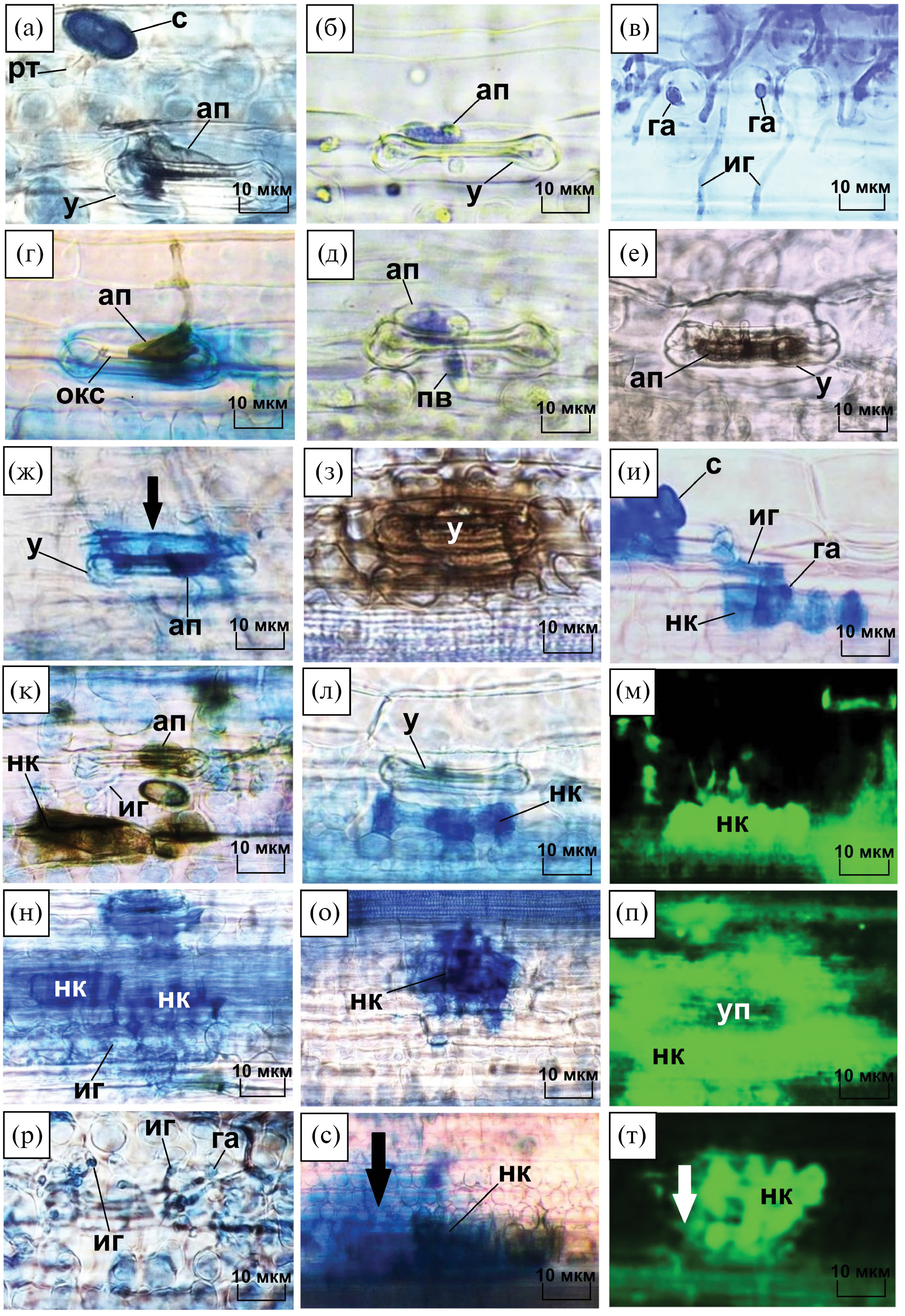 Рис. 3. Результаты влияния индукторов генерации АФК и NO на развитие Pgt на восприимчивом сорте Саратовская 29 (С29) (а, в, д) и устойчивой линии TcSr25 (б, г, е–т): а – пустой аппрессорий на устьице, б – аппрессорий на устьице с окрашенными митохондриями, в – колония с инфекционными гифами и гаусториями в мезофилльных клетках, г – накопление Н2О2 в цитоплазме отмершего аппрессория и появление отложений на стенках замыкающих клеток устьица, д – накопление O2•– в цитоплазме аппрессория и ПВ на устойчивом растении, е – накопление Н2О2 в аппрессории и ПВ, ж – повреждение цитоплазмы замыкающих клеток устьиц (стрелка), з – накопление Н2О2 в цитоплазме замыкающих клеток устьиц и примыкающих клеток, и – начальный этап гибели клетки растения в результате реакции СВЧ после внедрения гаустории, к – накопление Н2О2 в аппрессории и клетке, отмершей после внедрения гаустории, л – усиление окраски цитоплазмы клетки, погибшей в результате реакции СВЧ после обработки СК, м – автофлуоресценция цитоплазмы клетки, отмершей в результате реакции СВЧ после обработки СК, н – клетки растения с усиленной окраской и погибшие в результате реакции СВЧ, о – интенсивная реакция СВЧ в зоне колонии в устойчивой линии после обработки СК, п – автофлуоресценция отмерших клеток в зоне пустулы, р – образование инфекционных структур после обработки верапамилом, с – некротические клетки, погибшие в результате реакции СВЧ и зона коллапсированных клеток с усиленной окраской цитоплазмы (стрелка) после обработки НП, т – интенсивная автофлуоресценция клетки с разрушенной в ходе СВЧ цитоплазмой (стрелка) и слабая автофлуоресценция коллапсированных клеток рядом. Окраска: а, в, ж, и, л, н. о, р – анилиновый синий; б, д – НСТ; г, к, с – анилиновый синий + ДАБ; е, з – ДАБ; м, п, т – автофлуоресценция. Обозначения: ап – аппрессорий, га – гаустория, иг – инфекционная гифа, нк – некротическая клетка растения, окс – отложения на клеточной стенке, пв – подустьичная везикула, рт – ростковая трубка, с – спора, у – устьице, уп – урединиопустула.