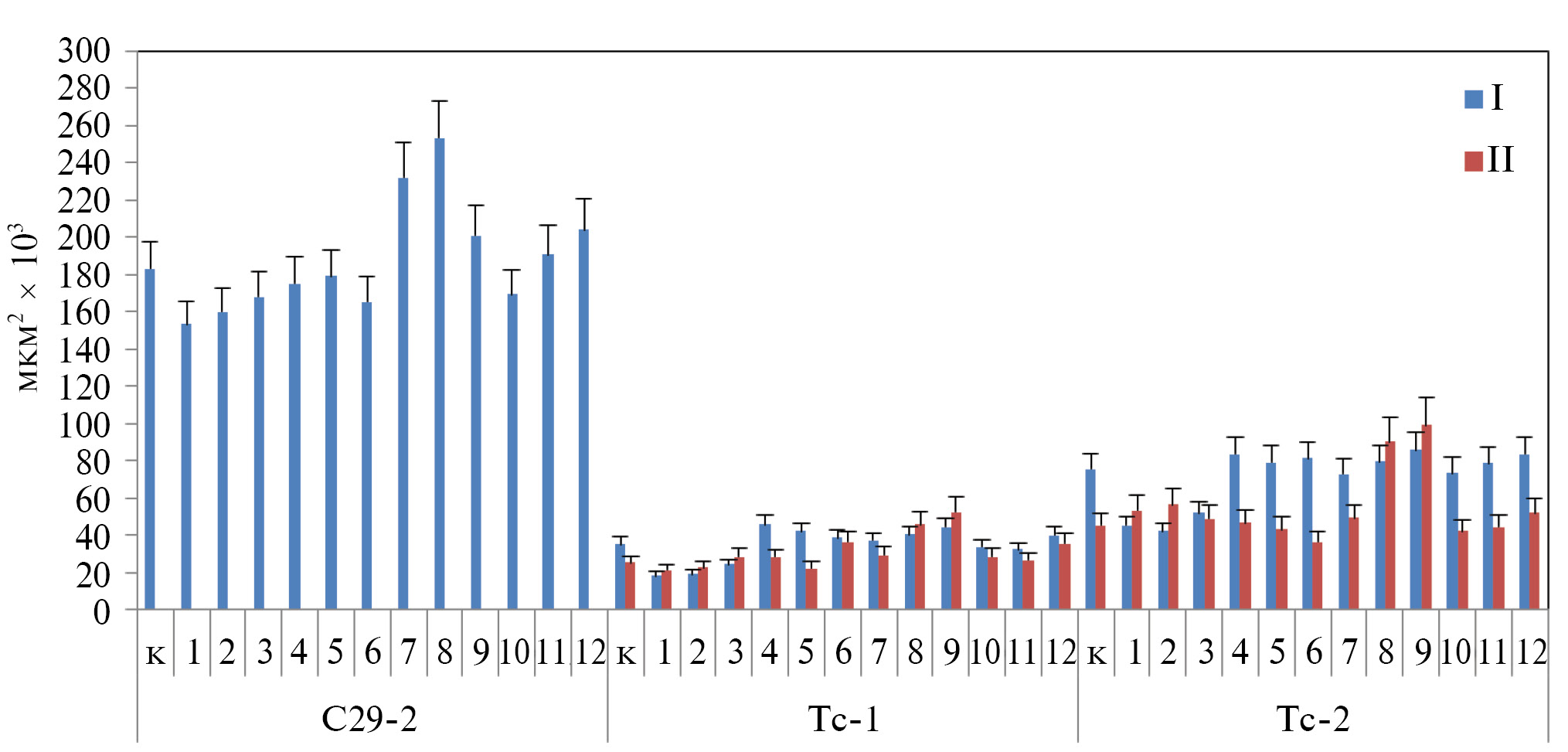 Рис. 4. Влияние обработки фармакологическими препаратами на площадь колоний патогена и зоны реакции СВЧ (240 ч п/ин): площадь, мкм2∙103: I – колонии, II – зоны некроза. С29-2 – сорт Саратовская 29 инфицированный изолятом Pgt2, Тс-1 и Тс-2 – линия TcSr25, инфицированная изолятами Pgt1 и Pgt2, соответственно. Варианты опыта: к – контроль; 1, 2, 3 – обработка СК; 4, 5, 6 – обработка верапамилом; 7, 8, 9 – обработка НП; 10, 11, 12 – обработка с-PTIO; сроки применения препаратов: 1, 4, 7, 10 – за 24 ч до инокуляции; 2, 5, 8, 11 – одновременно с инокуляцией; 3, 6, 9, 12 – через 24 ч после инокуляции.