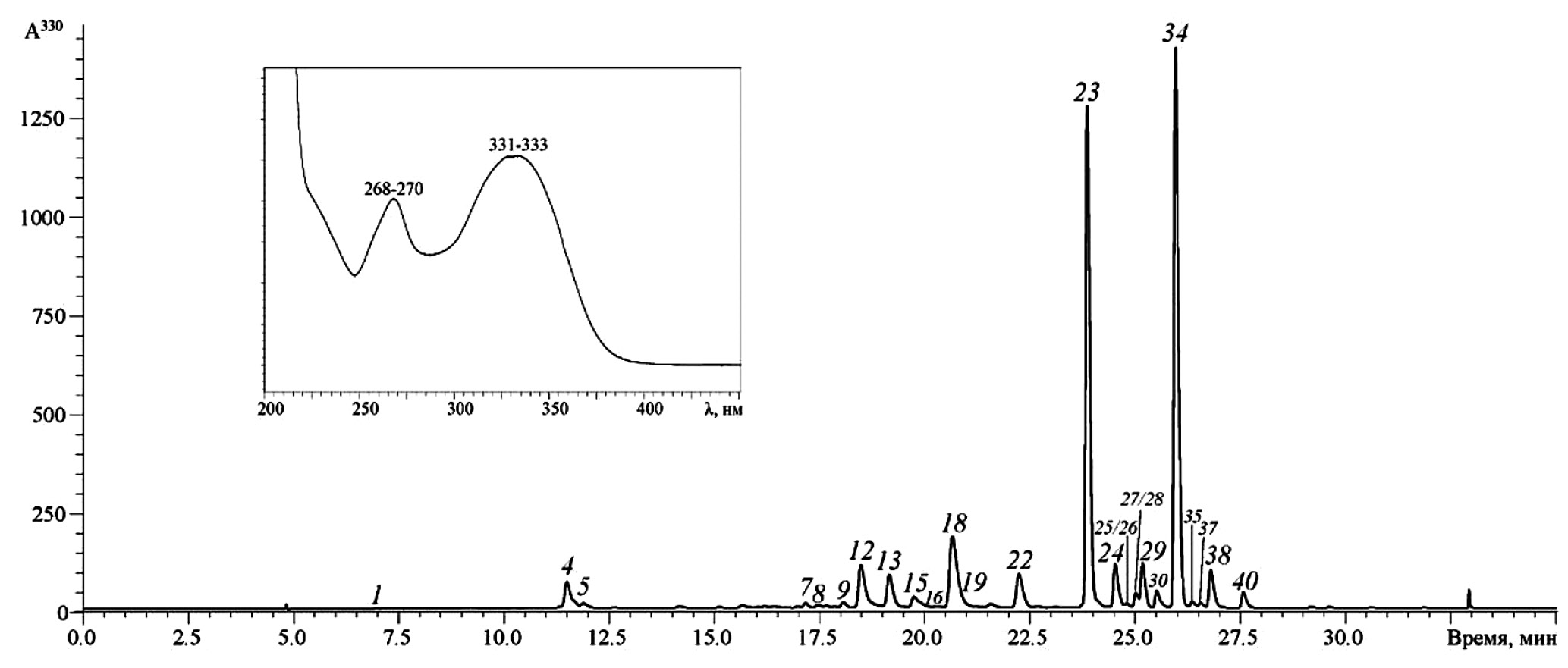 Высокоэффективная хроматография с диодно-матричным и масс-спектрометрическим детектированием с ионизацией электрораспылением (ВЭЖХ-ДМД-ИЭР-МС). Анализ осуществляли на жидкостном хроматографе LCMS-8050 (“Shimadzu”, Япония), соединенном с диодно-матричным детектором (ДМД) и 3Q-детектором с ионизацией электрораспылением (ИЭР/МС), используя колонку ReproSil-Pur 120 C18-AQ (250 мм × 4,6 мм × 5 мм; “Dr. Maisch GmbH”, Германия). Условия ВЭЖХ: подвижная фаза, элюент A – вода, элюент В – ацетонитрил. Программа градиента – 0–20 мин 2–80% B, 20–30 мин 80–100% B, 30–35 мин 100% B, 35–40 мин 100–2% B; инжектируемый объем – 1 мкл; скорость потока – 1 мл/мин, температура колонки – 30°C; диапазон сканирования спектров поглощения – 200–600 нм. Условия ИЭР/МС: режим ионизации – электрораспыление, положительная ионизация; температура интерфейса ИЭР – 300°C; температура линии десольватации – 250°C; температура нагревательного блока – 400°C; скорость газа-распылителя (N2) – 3 л/мин; скорость газа-нагревателя (воздух) – 10 л/мин; давление газа, используемого для диссоциации, индуцируемой соударением (CID газ, Ar) – 270 кПa; скорость Ar – 0.3 мл/мин; напряжение на капилляре – 3 кВ; диапазон сканирования масс (m/z) 100–1900. Для построения градуировочных графиков серию разведений веществ сравнения (1–100 мкг/мл) хроматографировали в описанных выше условиях трижды для каждой концентрации вещества. По полученным данным строили градуировочные графики в координатах “концентрация, мкг/мл – площадь пика” с применением пакета программ Advanced Grapher ver. 2.2 (“Alentum Software, Inc.”, США).