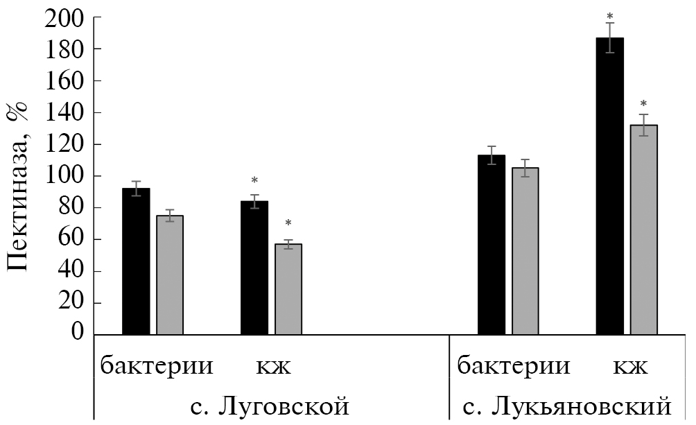 Активность пектиназ различных штаммов Pca. Количественный тест на активность пектиназы практически не выявил различий между штаммами Pca. Однако добавление к инкубационной среде кроме субстрата (пектин) гомогената из стеблей растений картофеля оказывало различное влияние на активность внеклеточной пектиназы Pca. В дальнейшем для более подробного анализа были выбраны штамм 22, по совокупности свойств признанный наиболее вирулентным и штамм 426, стимулирующий рост растений картофеля in vitro сорта Луговской (табл. 2). Исследования показали, что инкубация с гомогенатом из растений сорта Луговской снижала активность пектиназы, особенно в культуральной жидкости бактерий, но не в клетках бактерий, в то время как гомогенат из растений сорта Лукьяновский стимулировал активность пектиназы обоих штаммов, и в большей степени также в культуральной жидкости. Во всех случаях более высокую активность проявлял штамм 22 (рис. 1).
