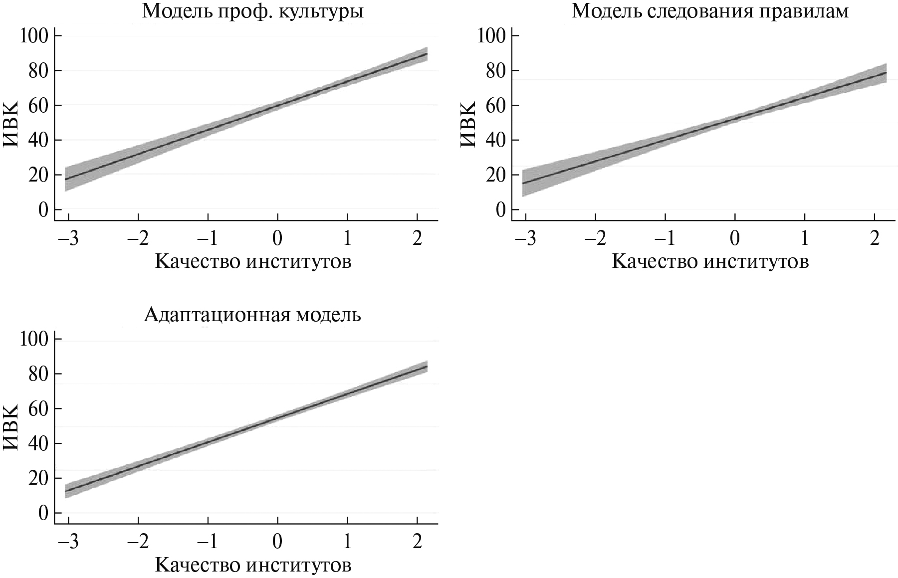 В ситуации слабых институтов лучше всего себя показывает адаптационная модель. Соответственно, результаты эмпирического анализа частично подтверждают третью гипотезу. Модель следования правилам в случае взаимодействия с качественными институтами показывает себя незначительно хуже, однако при прочих равных условиях не отличается от модели профессиональной культуры по результатам модели (4). Ограничением для обобщения полученных результатов потенциально служит размер исходной выборки стран. Между тем, как представляется, даже она позволяет выявить рассматриваемые взаимосвязи с точки зрения количественного подхода.