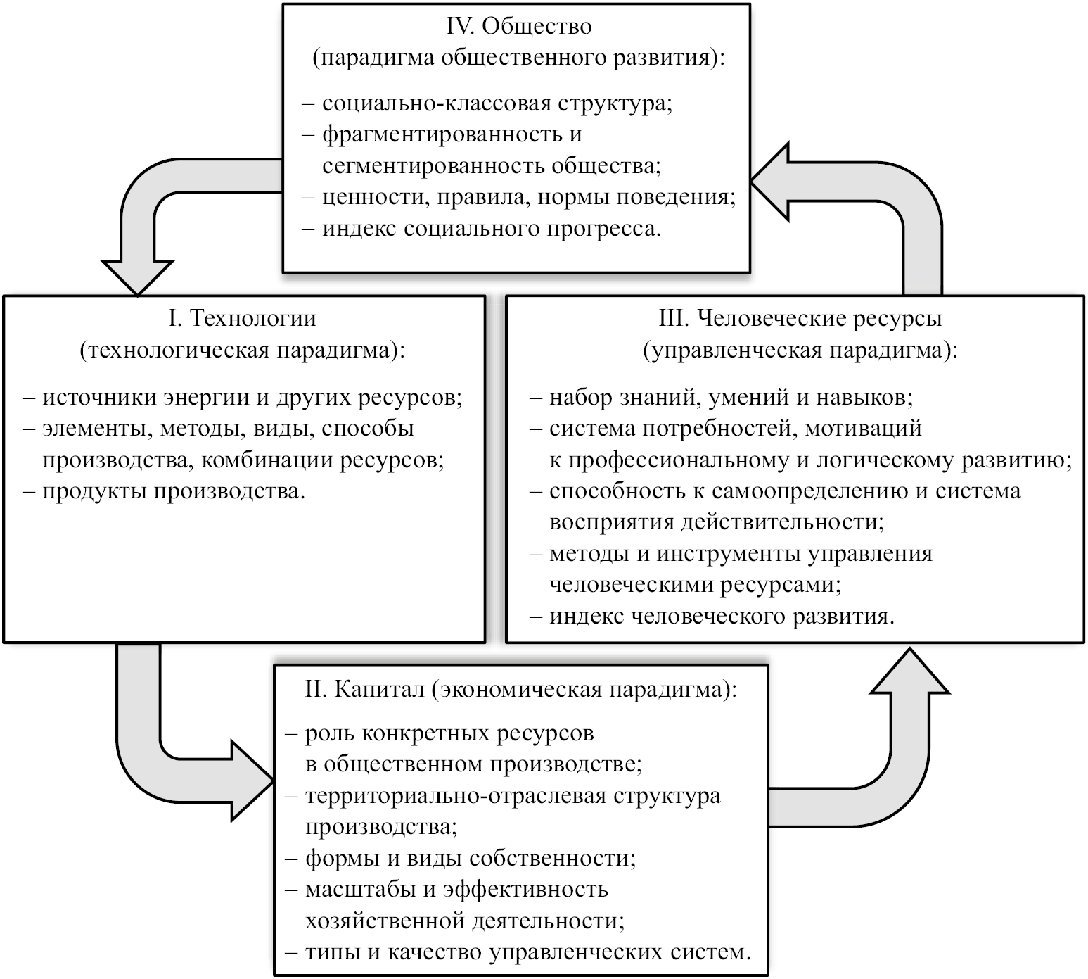 Теории циклов накопления капитала Дж. Арриги, технологических укладов С.Ю. Глазьева, технико-экономических ценозов Л.Г. Бадалян и В.Ф. Криворотова наглядно демонстрируют логику и хронологию формирования технологических, экономических и социально-культурных общественных условий на основе расширения и миграции капитала. В сфере общественного производства раскрывается заложенный в технологиях потенциал повышения производительности труда. Накопленный за счет роста производительности капитал предъявляет спрос на ресурсы, поддерживающие такое накопление, и, по сути, определяет направления и возможности дальнейшего развития экономики. Ключевые технологии как «полюсы роста» устанавливают требования к качественным характеристикам человеческих ресурсов, поэтому специфика жизненного уклада и труда людей в значительной степени обусловлена динамикой технологических и адаптированных к ним экономических процессов. Формируются соответствующие друг другу технологическая, экономическая, управленческая парадигмы и парадигма общественного развития (рис. 1).