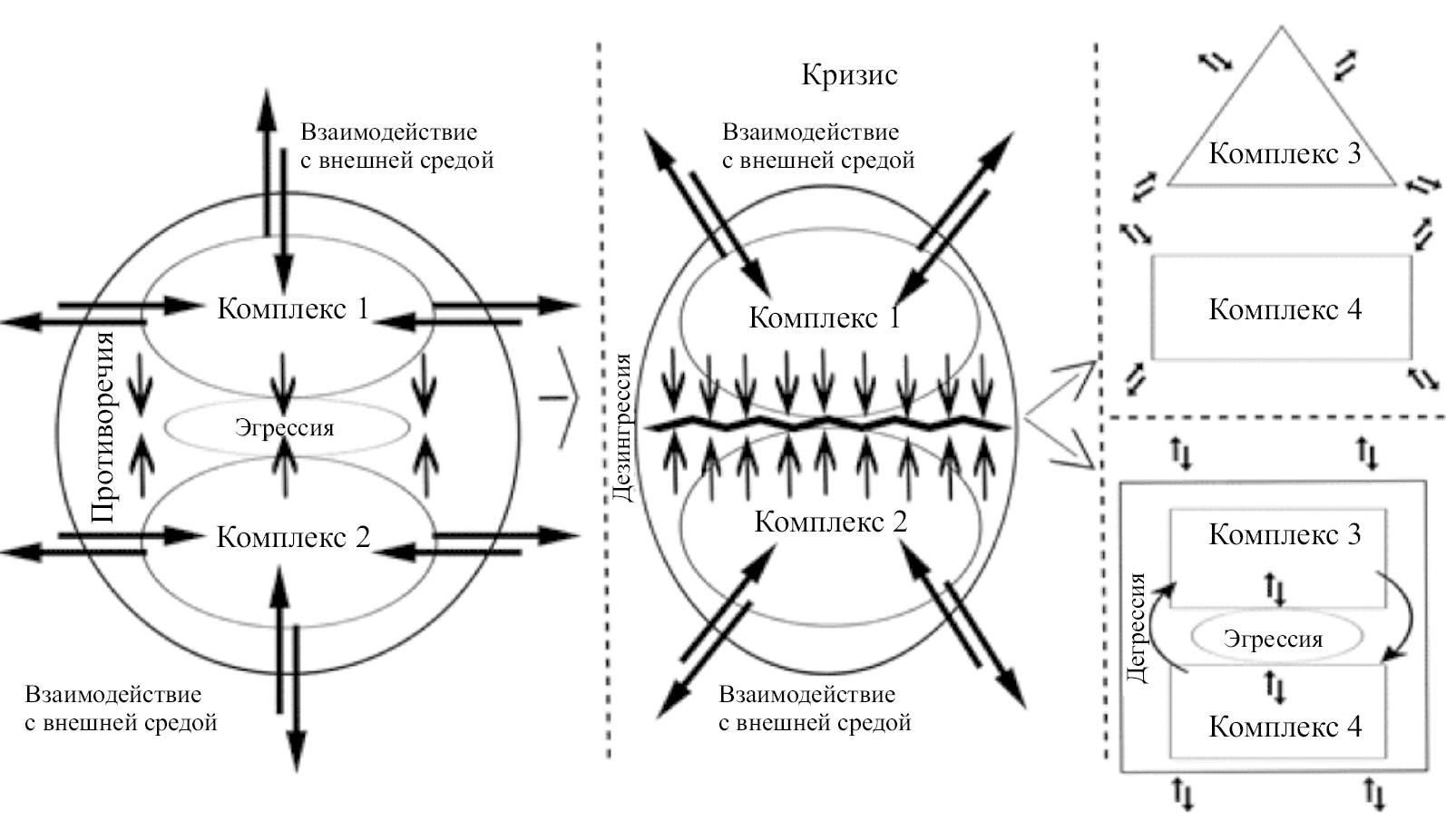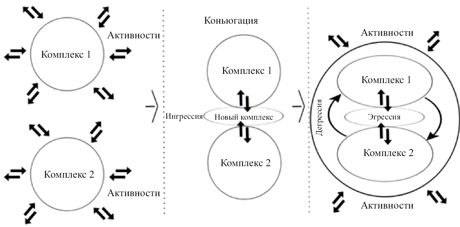 В наиболее общем виде механизмы организации и дезорганизации системы представлены на рис. 1–2. Изначально две отдельные системы (комплекса) 1 и 2 проявляют активность в среде (конъюгация) и противостоят ее воздействиям (рис. 1). При образовании между ними связи (ингрессия) они объединяются в новую систему. Когда процесс объединения завершен, начинают действовать внутриструктурные механизмы, образуются управляющий элемент (эгрессия) и «каркасный» элемент (дегрессия).