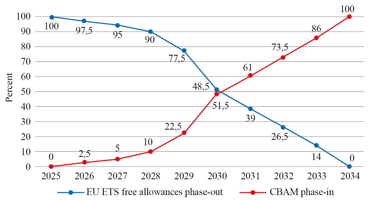 Figure 1. Schedule for the withdrawal of free EUAs from the EU ETS and the introduction of taxation on imported products in the CBAM in the volume of EU industrial emissions in 2026–2034, %