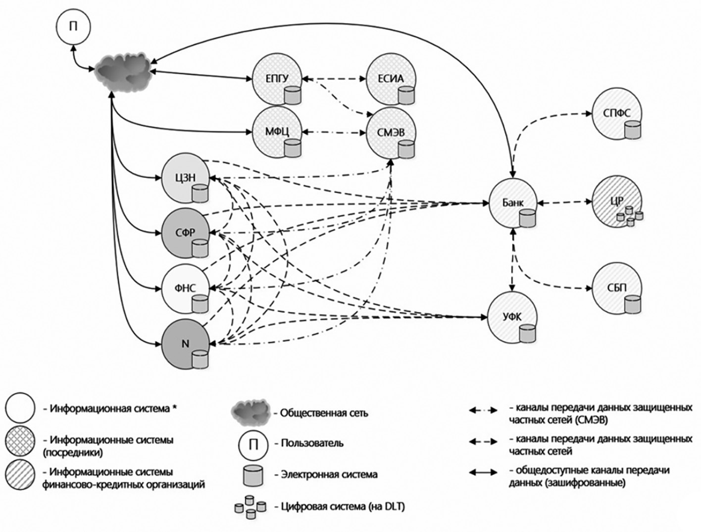 5 Разный оттенок фона информационных систем отражает фрагментацию электронного пространства: ЕПГУ – Единый портал государственных услуг; ЕСИА – Единая система идентификации и аутентификации; МФЦ – система многофункциональных центров; СМЭВ – Система межведомственного электронного взаимодействия; СПФС – Система передачи финансовых сообщений Банка России; ЦР – платформа цифрового рубля; СБП – система быстрых платежей; УФК – система Управления федерального казначейства; ЦЗН – система Центра занятости населения; СФР – система Социального фонда России; ФНС – система Федеральной налоговой службы; N – системы иных экономических субъектов.
