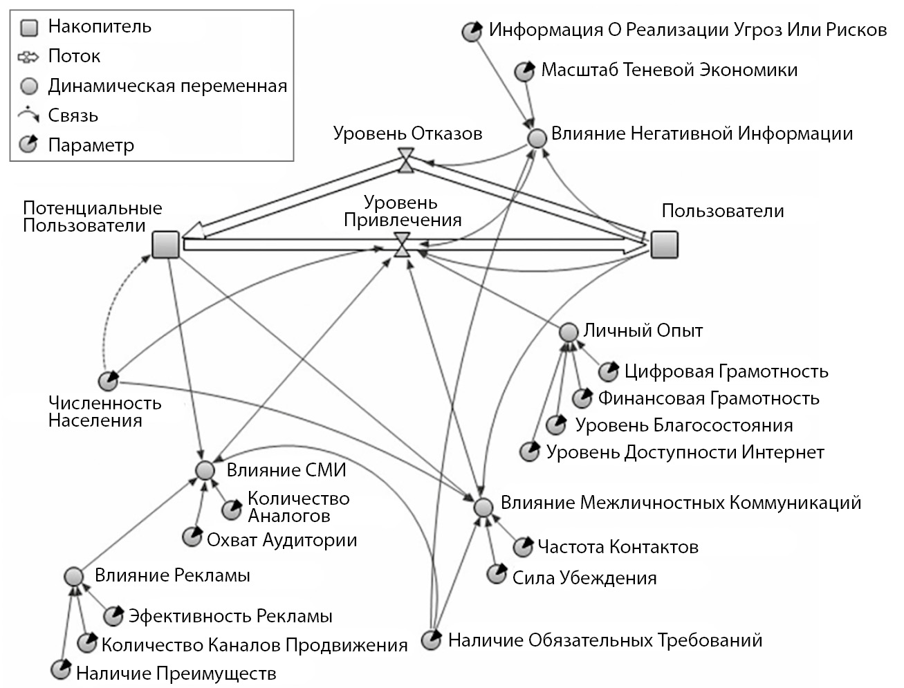 Адаптируя стандартную модель Басса под исследовательские задачи, мы расширили ее дополнительными факторами, которые влияют на распространение цифрового рубля как инновации, и визуализировали в виде системно-динамической модели (рис. 5) на базе авторского программного обеспечения системно-динамического моделирования распространения финансовых инноваций в информационном обществе8 (разработано на Java для Any Logic).