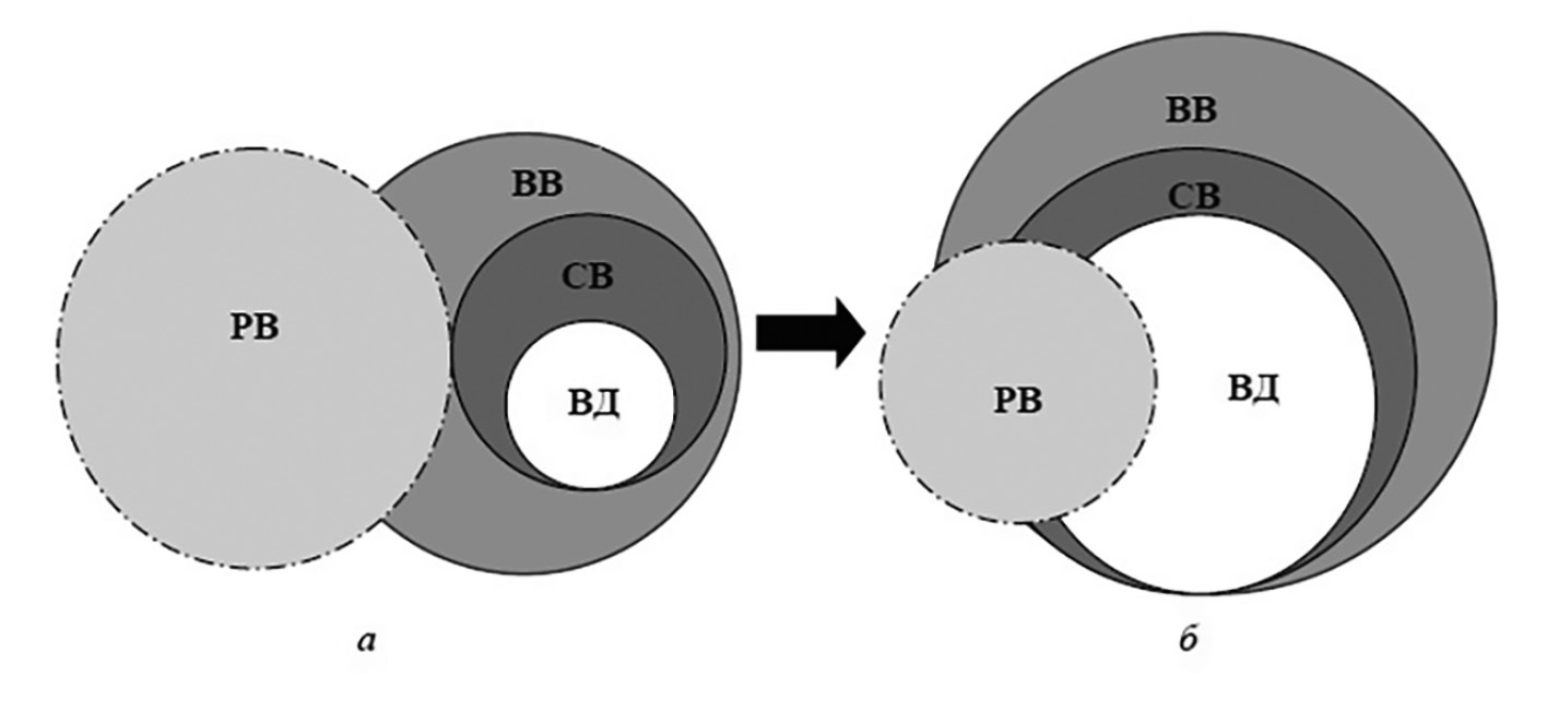 Во-вторых, в условиях повышения технологизации труда и быта наибольший прирост времени в составе ВВ пришелся на СВ, а внутри него на ВД, вовлеченного в симуляционное потребление, которое создается и воспроизводится трудом миллионов занятых в высокотехнологичной сфере. При когнитивном капитализме в структуре увеличившегося в объеме ВВ сократились временны́е затраты работника на трудовую деятельность. Указанные издержки никак не оплачивались в классической капиталистической модели, хотя фактически втягивались в РВ: поездки на работу; регламентированное пребывание на рабочем месте; строгий режим труда; жесткий хронометраж трудовых операций; различные личные согласования и иные «тейлористские пережитки» организации труда. За последние три десятилетия РВ занятых в высокотехнологичных секторах экономики США частично перешло из сферы регламентируемого и четко оплачиваемого за отработанные часы труда в пространство СВ, с которым раньше только граничило, а нарушение границы СВ требовало повышенной оплаты сверхнормативной работы. Наблюдаемый в США рост прекаризации труда в высокотехнологичных секторах экономики [Минат 2023б] косвенно указывает на слияние РВ и СВ значительной части занятых. Следовательно, сократившееся формально РВ метаморфизируется трижды (см. рис.1 б): 1) во взаимодействии с частью ВВ, связанной с трудовым процессом; 2) с частью СВ (например, в условиях прекарной занятости); 3) с частью ВД, путем стирания границы между потреблением (досуговыми практиками, включая виртуальные) и трудом (работой в цифровом сетевом пространстве).