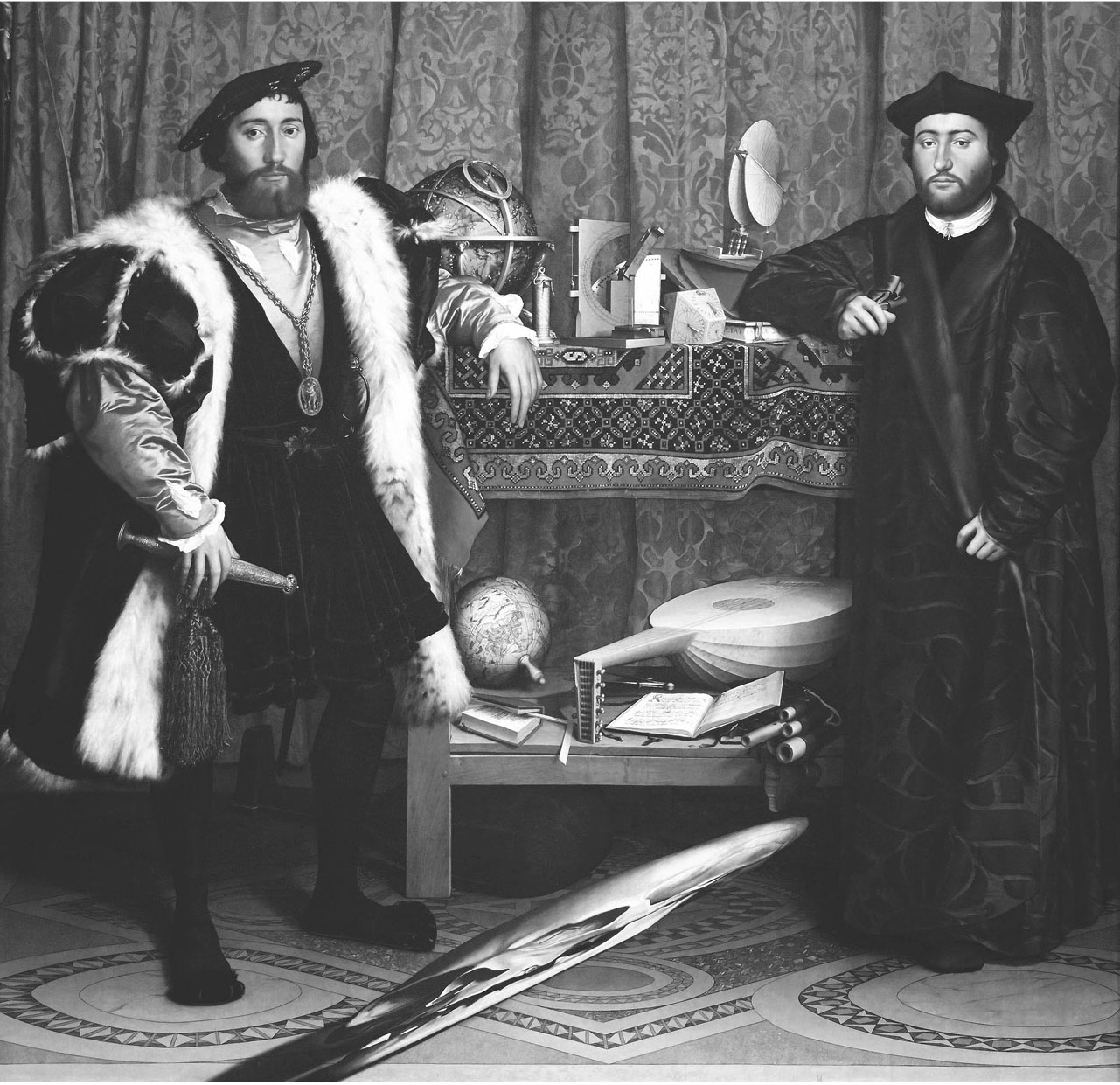 Написанные3 в 1533 году «Послы» Ганса Гольбейна Младшего (1497–1543) — одна из самых известных, узнаваемых и загадочных картин Северного Возрождения, стимулировавшая многочисленные исследовательские усилия и породившая не менее многочисленные истолкования, стремившиеся за «обманчивым» реализмом изображенной Гольбейном сцены обнаружить множество, «потаенных схем»4, «скрытых значений» или отголосков «тайных наук». В галерее написанных Гольбейном портретов (преимущественно поясных, ср., например, портреты Эразма Роттердамского, Томаса Мора, Генриха VIII, Анны Болейн, Джейн Сеймур, Катарины Говард, Томаса Кромвеля, Шарля де Солье, астронома Николая Кратцера или купца Георга Гиссе) «Послы», действительно, занимают особое место. На ней в полный рост изображены два молодых человека, непринужденно опирающихся на стол, на двух ярусах которого располагается множество тщательно выписанных предметов. Нам известны имена этих людей, их социальное положение и даже возраст. Картина была написана для двадцатидевятилетнего французского посла при дворе английского короля Генриха VIII Жана де Дентевиля. На ней он изображен (слева) со своим другом, епископом Лавора Жоржем де Сельвом (ему на момент написания картины двадцать пять лет), также выполнявшим посольские поручения, в том числе при папском дворе и в Венецианской Республике. Одной из главных особенностей этого полотна Гольбейна является искаженное изображение черепа (анаморфоз) на его переднем плане, вносящее динамический оптический и смысловой диссонанс во в целом статичный визуальный порядок картины5.