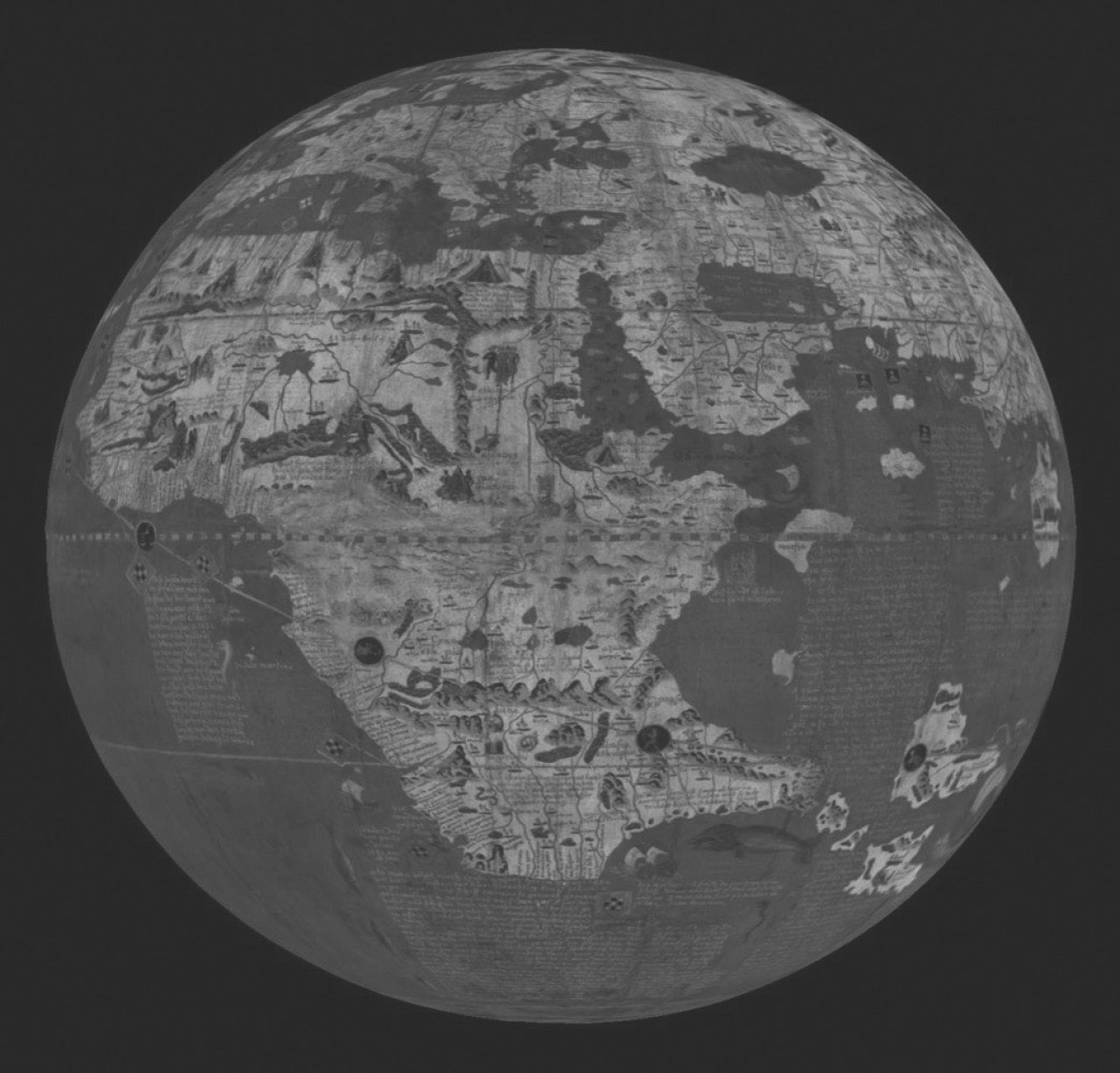 «Земной глобус, сконструированный в Нюрнберге в 1492 году для Мартина Бехайма, содержит 111 миниатюр, выполненных Георгом Глокендоном. Среди них: 48 флагов (10 из которых португальские); 15 гербов с геральдическими цветами; 48 изображений королей, сидящих в шатрах или на троне; 11 кораблей, плывущих по морю; различные рыбы, морские львы, морские коровы, морские коньки, морские змеи, тритоны, сирены, слоны, леопарды, медведи, верблюды, попугаи (но нет ни летучих рыб, ни китов, которых Бехайм должен был видеть собственными глазами во время своих путешествий); два сциопода в Южной Африке. <…> глобус изобилует записями — около 1100 топонимов. К ним добавлены легенды, которые варьируются от отдельных предложений до сложных составных текстов. Глобус поддерживает постоянную метонимическую связь с библиотеками географов и путешественников. Большая часть информации, номенклатуры и очертаний заимствуется из книжных источников»23.