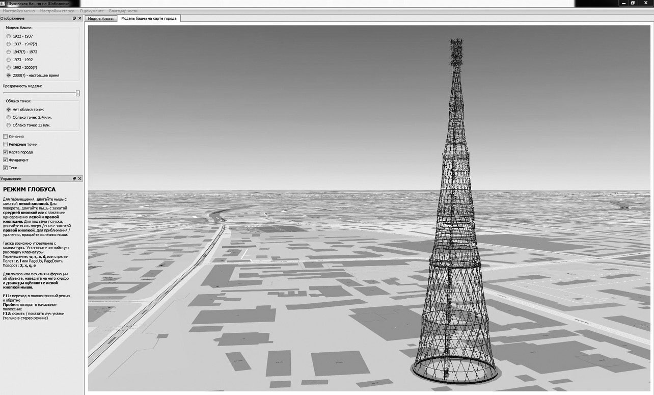 Рис. 1. Интерактивная визуализация 3D-моделей Шуховской башни на Шаболовке на основе OpenSceneGraph. Демонстрация полигональной 3D-модели в привязке к геопространственной основе (карта Open Street Map). Программа для ЭВМ «Программа визуализации 3D-моделей Шуховской башни на Шаболовке» (Александр Бобков, Андрей Леонов).