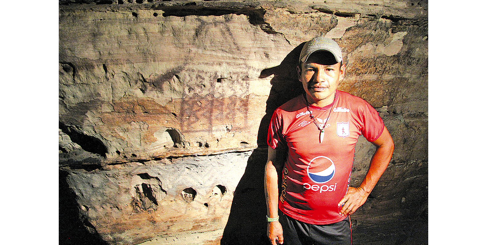 Фото 3. Хорхе Санчес рядом с Рисунком № 1 в сакральной пещере в Серро-Аси. Фото автора, 2023 г.
