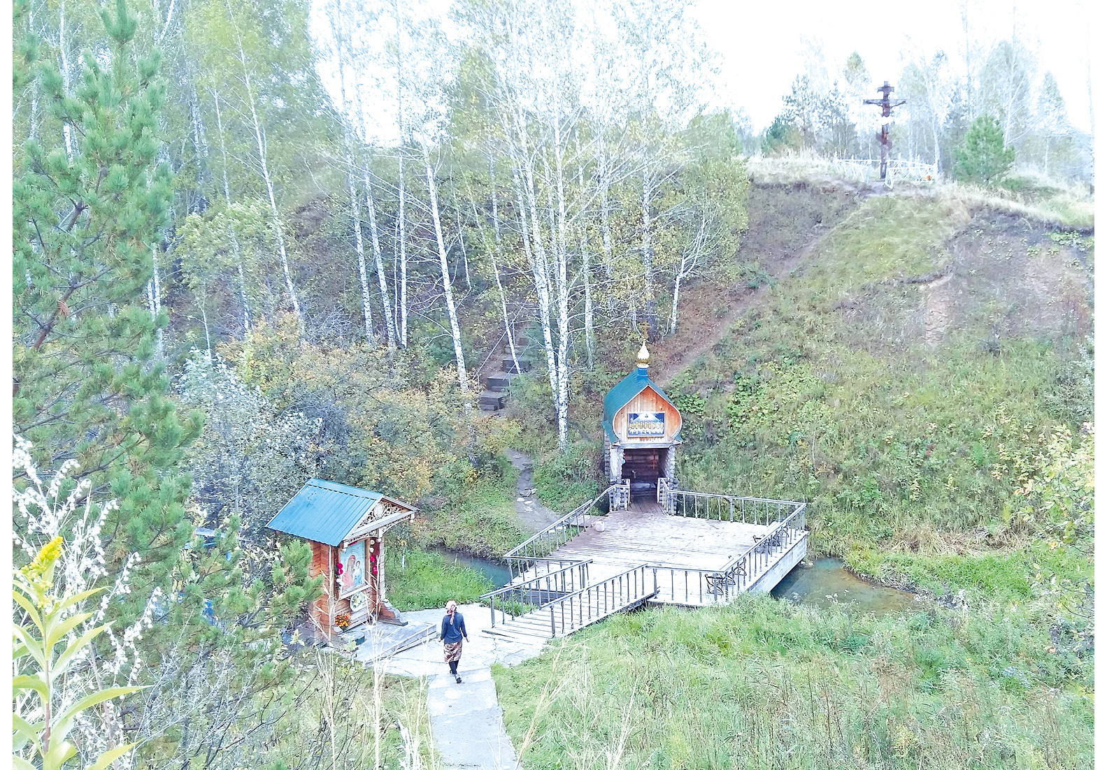 Святой ключ в с. Сорочий Лог в данном отношении представляет особый интерес как один из наиболее известных алтайских источников, вобравший в себя память о локальных событиях Гражданской войны. В настоящее время помимо самого источника сакральный комплекс включает относящиеся к “сфере влияния” женского Иоанно-Предтеческого скита, построенного неподалеку в начале 2000-х годов, установленную рядом с ключом икону, купальню, деревянное распятие и расположенную в ближней роще братскую могилу (см.: Рис. 1).