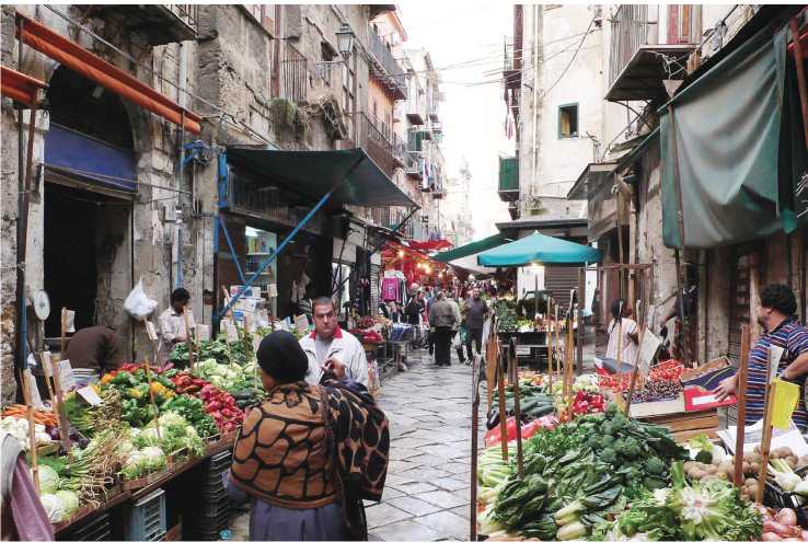 Исторические рынки “живы” во многих городах Сицилии. К числу наиболее древних относятся: Ballarò (IX в.), Capo (IX в.), La Kalsa (X в.), Vucciria (XIII в.) в Палермо и Fera o luni (1493 г.) в Катании; рыбные рынки: Antigo Mercado в Марсале (1315 г.), ‘A pischiria (1422 г.) в Ачиреале, Pischiria (XV в.) в Катании и Pischiria (XVII в.) в Шакке; зеленные рынки, например Strat’a fogghia (XVI в.) в Калтаниссетте; фруктово-овощные – Borgo Vecchio (1556 г.) в Палермо; мясные – в Сант’Агата ди Милителло (1500 г.) и т. д. (Sorgi 2007: 60). Существуют и два непищевых исторических рынка, оба в Палермо – Lattarini (сегодня там торгуют подержанной одеждой), потомок средневекового рынка тканей, сформировавшегося в Х в. в недрах арабского базара специй Suk-el-Attarin (Schirò s. d.), и Mercato Sant’Agostino, с XII в. специализирующийся на торговле дорогими тканями (Stigliano 2020).