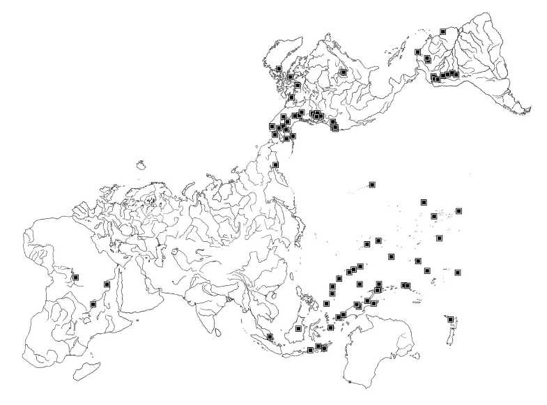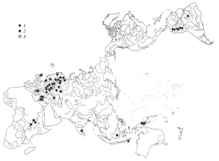 Отличающиеся от (обычных) людей обитатели далекой страны время от времени сражаются с нападающими на них врагами нечеловеческой природы – чаще всего перелетными птицами. Этот мотив (K22 в каталоге) был нами рассмотрен раньше (Berezkin 2007). Сейчас мы не станем описывать отдельные случаи, но лишь отметим на Рис. 3, с какими именно традициями связаны поставленные на карте значки. Речь идет об одной из самых ярких и очевидных параллелей между мифологиями Древней Греции и Фенноскандии, с одной стороны, и Северной Америки (а также Древнего Китая) – с другой. Содержание мотива предполагает его генезис в умеренных или северных широтах, где сезонные миграции птиц во всех отношениях значимы. Хотя мотив проник в средневековую арабскую письменную традицию (Scobie 1975: 124; Stang 1982: 23), в ней он, скорее всего, восходит к греческим источникам. Наиболее подробные и разнообразные версии представлены в Северной Америке, особенно на Аляске, северо-западном побережье и Колумбийском плато, хотя их также немало на севере Равнин, на юго-западе и на юго-востоке континента. Повествования с соответствующими эпизодами зафиксированы и в Южной Америке, но наверняка были принесены туда теми предками индейцев, чей маршрут проходил через Берингию и североамериканский северо-запад.