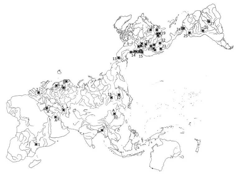 Рис. 3. Журавли и пигмеи. Отличающиеся от (обычных) людей обитатели далекой страны время от времени сражаются с нападающими на них врагами нечеловеческой природы (чаще всего перелетными птицами). 1. Чагга. 2. Французы (департамент Жер). 3. Арабская письменная традиция. 4. Древняя Греция. 5. Грузины. 6. Скандинавы. 7. Финны. 8. Западные саамы. 9. Сема-нага. 10. Древний Китай. 11. Эвенки Китая. 12. Нанайцы. 13. Инупиат Берингова пролива. 14. Тлинкиты, цимшиан, беллакула. 15. Комокс, снохомиш, скагит, нискуалли, якима. 16. Фокс. 17. Сарси, черноногие, гровантр. 18. Кроу. 19. Натчез, алабама, чикасо. 20. Чироки. 21. Зуньи, навахо, хикарилья, западные апачи. 22. Липан. 23. Тараумара. 24. Эмбера, нонама, куна. 25. Шуар. 26. Такана. 27. Куйкуро, камаюра