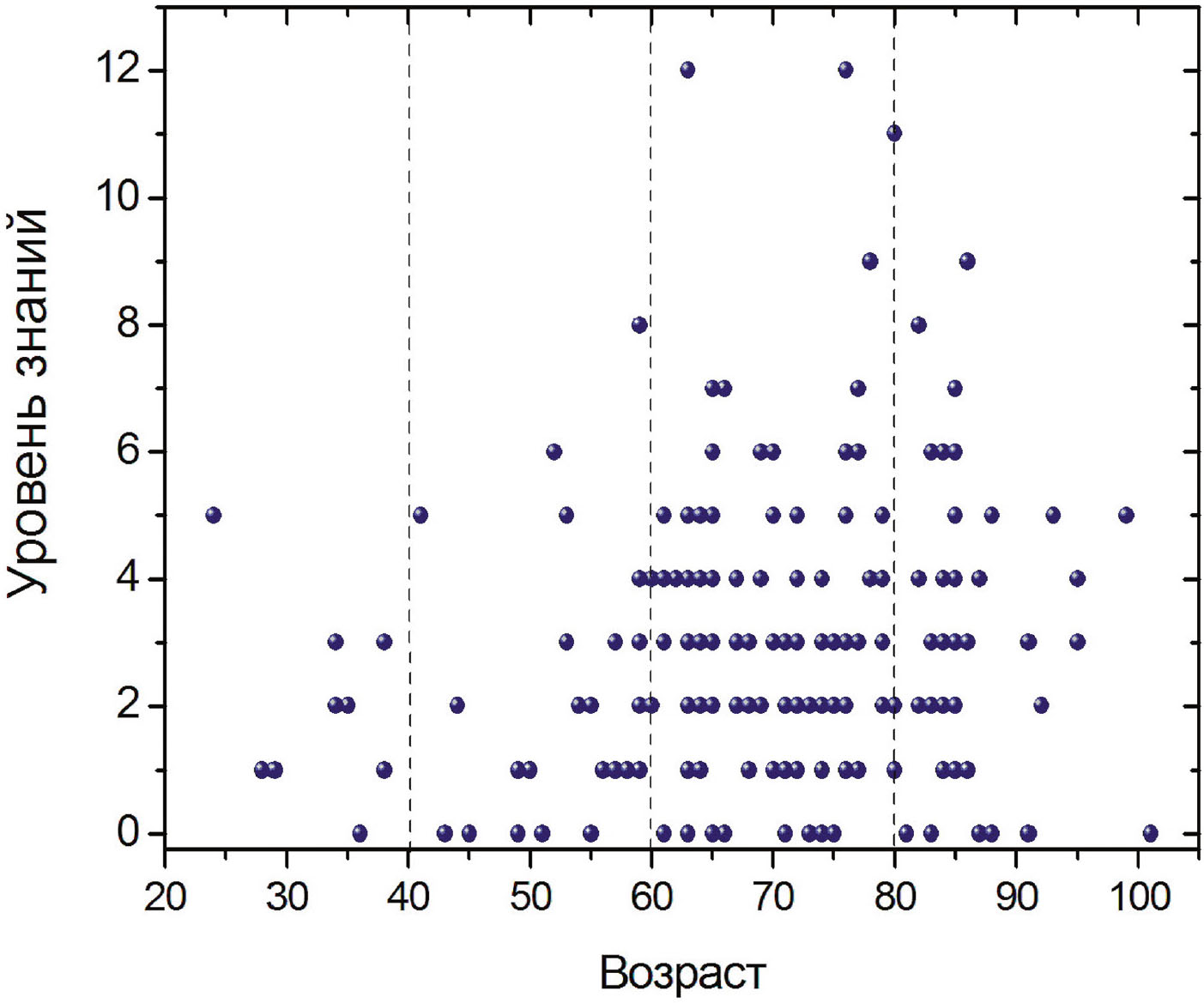 На Рис. 2 представлена зависимость уровня знаний информантов от возраста. Картина, отраженная на графике, может быть описана следующим образом. По словам абсолютно всех опрошенных, знания о звездах они получили в детстве в кругу своей семьи, т. е. от кого-то из родителей, бабушек или дедушек. Поэтому можно считать, что к 20 годам знания в основном уже сформированы, и точки на графике располагаются слева направо параллельно оси времени: меняется возраст информантов, но уровень знаний остается неизменным. Накопление знаний, приводящее к росту k, если и происходит, то в очень редких случаях, поскольку, во-первых, астрономическая информация не актуальна для большинства людей, а во-вторых, все знают примерно одно и то же. Скорее возможен процесс потери знаний, когда человек с возрастом забывает часть информации или не может ее оперативно вспомнить во время опроса.