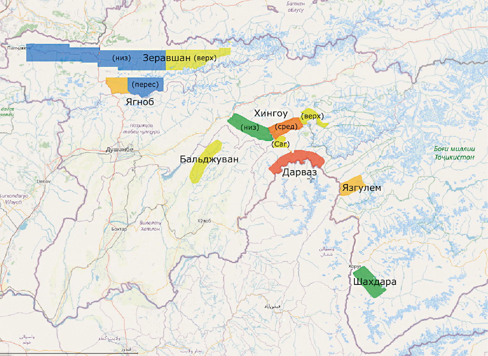 Долина р. Язгулём, исследованные части долины р. Шахдары и Бальджуванского района занимают относительно компактные территории протяженностью 25–30 км, поэтому они не делились на части, и относящиеся к ним сведения анализировались нами как единые наборы информации.
