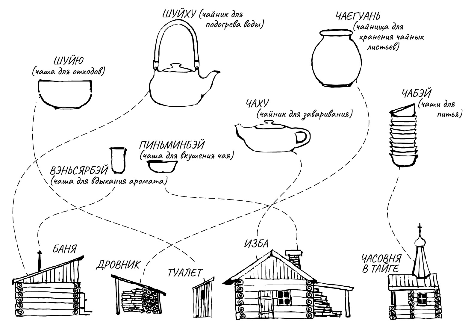 Рис. 2. Таежная заимка как метафора “китайского сервиза” (иллюстрация понятия "пространственно-распределенный объект" А. Джелла). Рисунок А. Копыльцовой