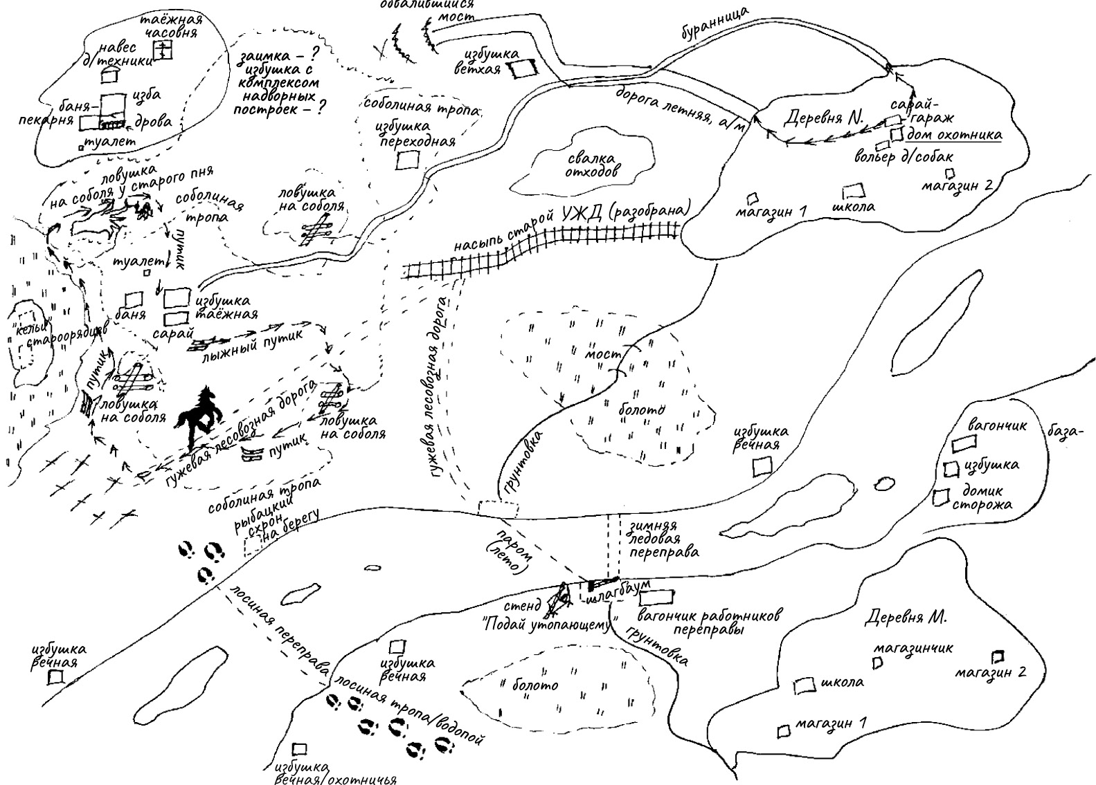Рис. 3. Ландшафт промысловых таежных и речных избушек, представленный в виде “детской карты сокровищ”. Полевой сезон январь–май 2024 г. Рисунок автора