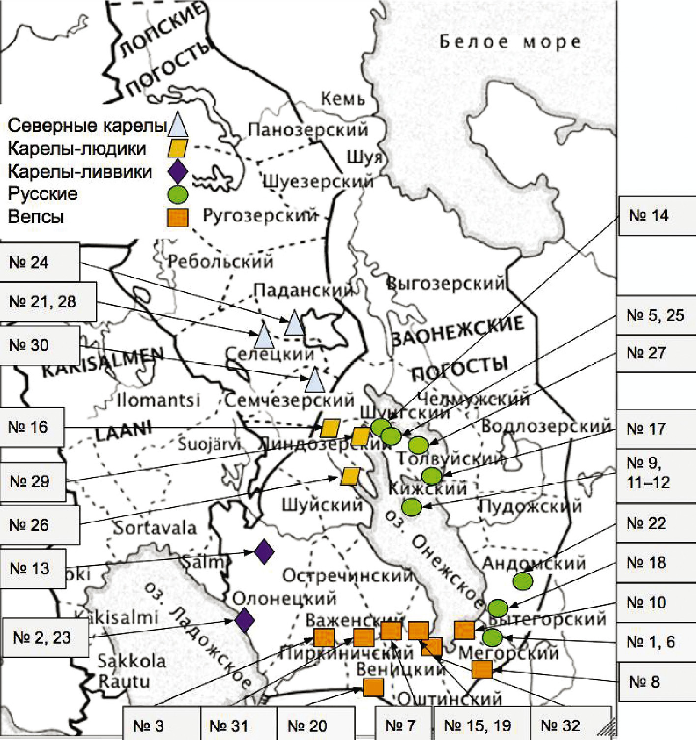 Исходя из идеи о тесной взаимосвязи между становлением этносов и развитием административно-территориальной и церковно-приходской систем края, А.Ю. Жуков соотнес осваивавшиеся вепсами, карелами и русскими территории, локализованные лингвистами, с конкретными погостами и волостями Олонецкого уезда (Жуков 2003: 58). В частности, исследователь утверждает, что “большая часть вепсов” в XV–XVII вв. “проживала в Оштинском, Остречинском, Важенском, Веницком и Пиркинском погостах” (Жуков 2019б: 295). По мнению автора, с XVII в. началось формирование “трех основных этнических общностей карелов” (Жуков 2019а: 33). Группа северных карел осваивала, указывает А.Ю. Жуков, земли Ребольского погоста, вошедшего в состав Корельского уезда и после 1617 г. включенного в состав Кольского уезда Российского государства, а также семи Лопских погостов – Линдозерского, Семчезерского, Селецкого, Паданского, Ругозерского, Панозерского и Шуезерского (Там же: 31). Складывание этнической группы карел-людиков, с точки зрения автора, происходило в пределах Шуйского, Кижского (Кондопога, Лычный остров, Чеболакша, Мелой Губа, Лижма), Толвуйского (Кузаранда, Тубозеро) и Важенского (Святозеро, север Присвирья) погостов, карел-ливвиков – в границах Олонецкого погоста (Жуков 2019а: 35; Жуков 2010а: 89).