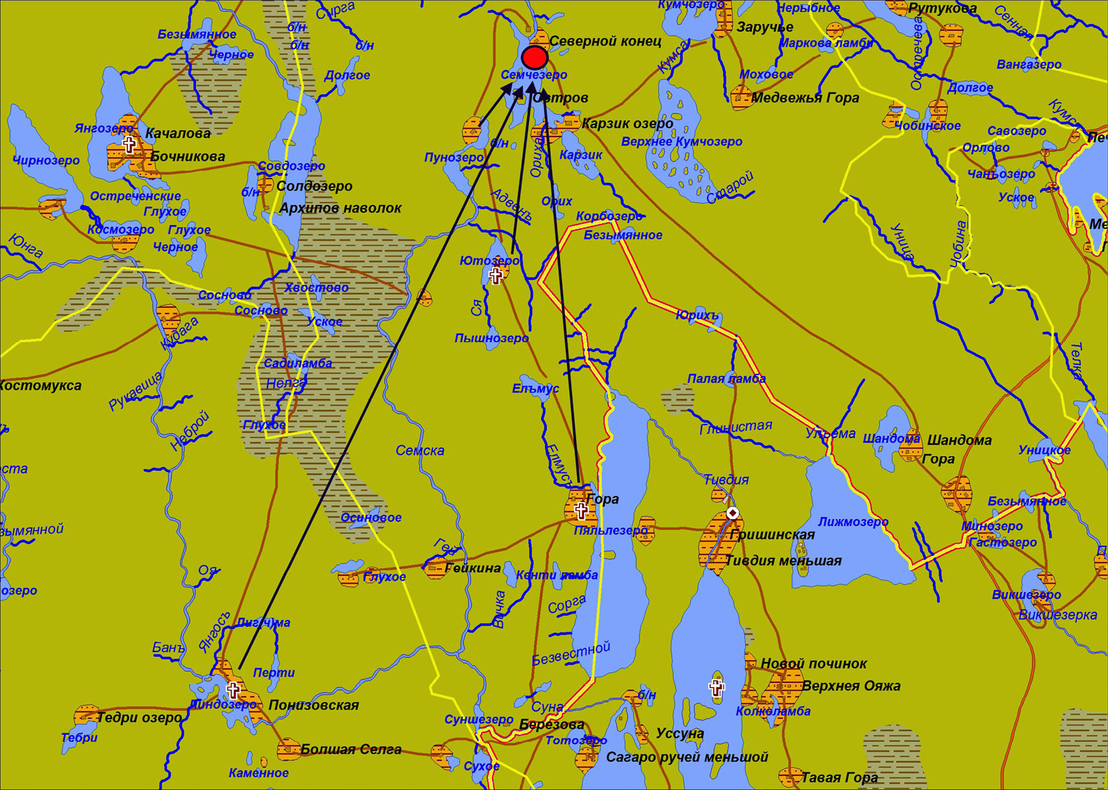 Рис. 3. Престольный праздник в Святнаволоке Семчезерского погоста в 1680 г.: ареал праздничных связей (источник: ГИС 2011)