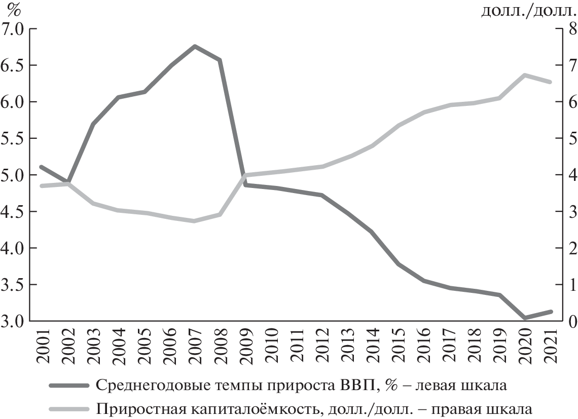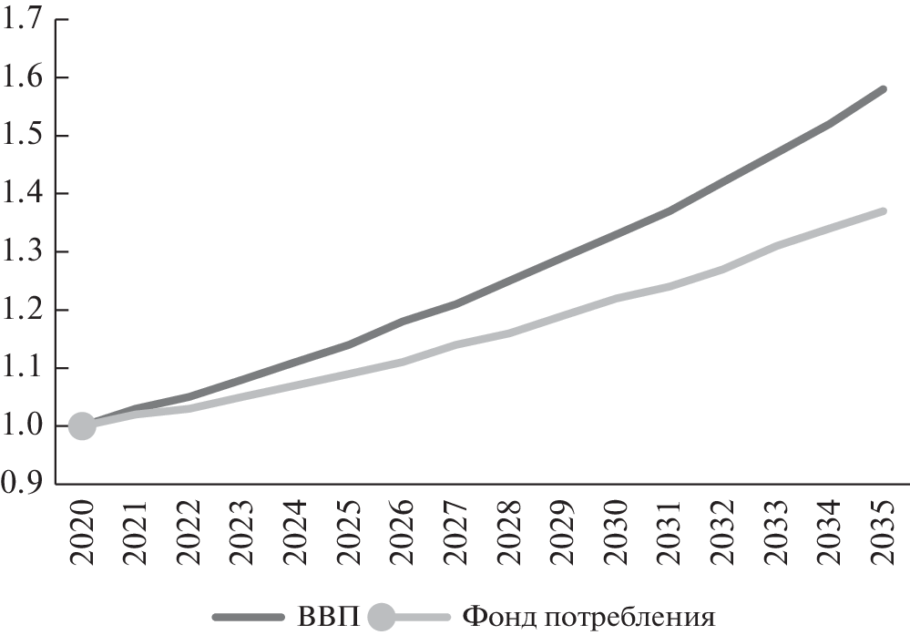 The purpose of this article is to predict the likely dynamics of Russia’s GDP and consumption fund for 15 years, based solely on highly aggregated characteristics of investment activity—the savings rate and the incremental capital−output ratio. Hypotheses regarding investment parameters are formed with account for their values and trends during the retrospective period 2001–2020. The results of forecast calculations show that there is a fundamental possibility to ensure the average annual GDP growth rate for the period up to 2035 at approximately 3%. This will require serious investments to increase the savings rate to 26−27% in three to four years, at the same time significantly improving the quality of the investment resource and the return on additional capital, and to begin forming a production apparatus on a new technological platform.