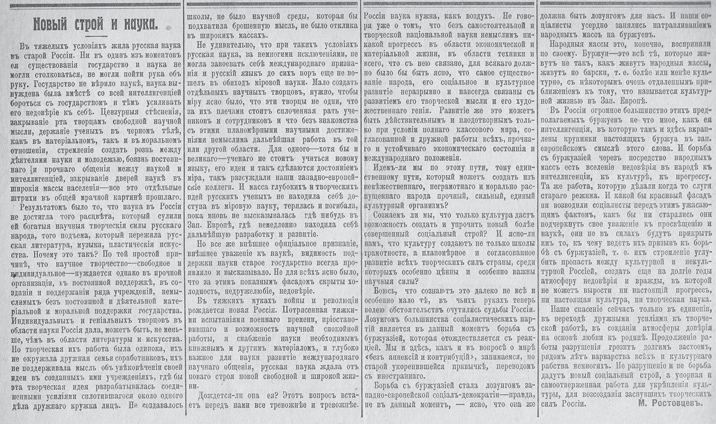 Recently, a small, undeservedly forgotten article by Academician M.I. Rostovtsev was discovered in the newspaper Svobodnyi Narod (Free People) of the Cadet Party (Petrograd) under the title “New System and Science.” It was published in August 1917. Its leitmotif is that only firm state power can guarantee the preservation and development of culture and science in Russia. The weakening of the state as a result of powerful revolutionary upheavals, according to the scientist, is the main danger to the scientific life of the country. This publication is interesting even now, during the difficult period of reforming science and education in modern Russia.