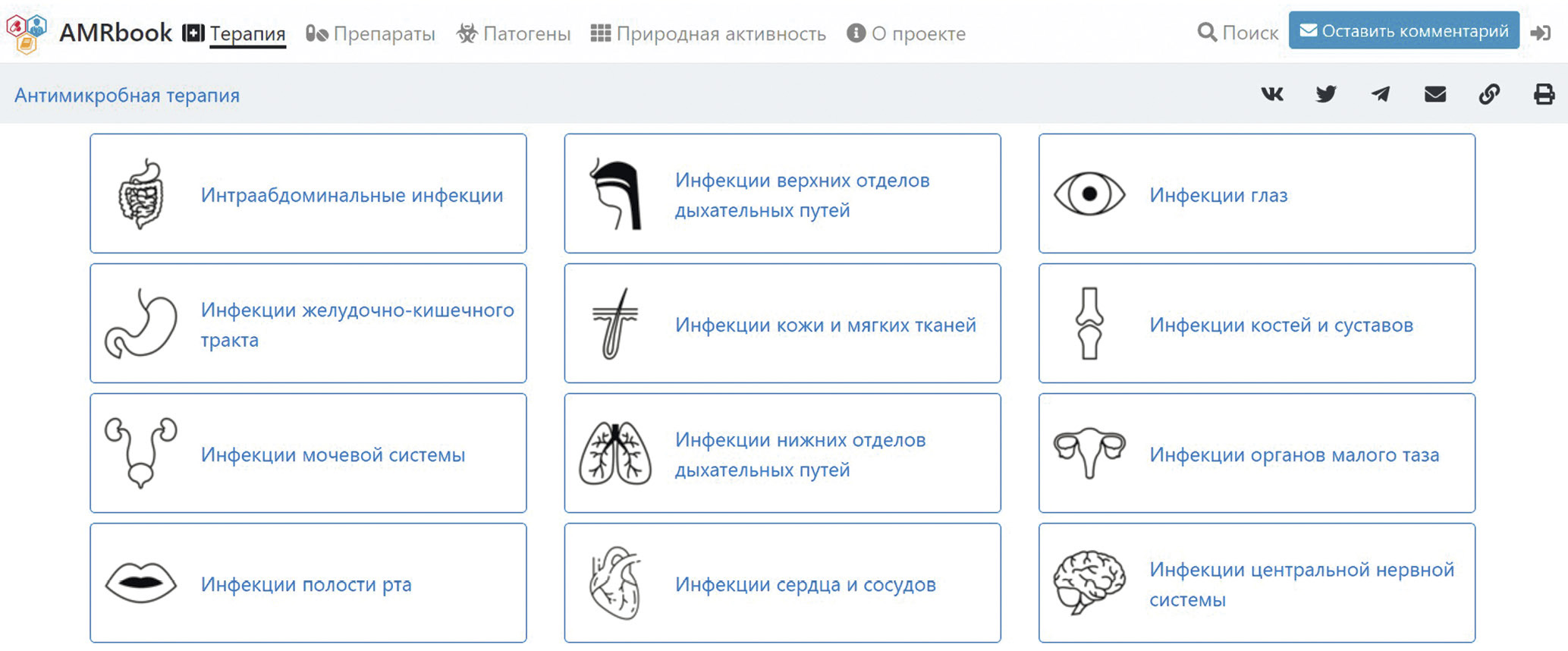 Онлайн-справочник антимикробной терапии (AMRbook.ru). С целью оперативного доступа к стартовым алгоритмам антимикробной терапии был создан веб-портал и мобильное приложение AMRbook.ru. Этот ресурс позволяет в доступном виде в режиме реального времени представлять схемы алгоритмов антимикробной терапии для инфекций различных локализаций, содержит информацию о АМП, спектре их природной активности, а также описание микроорганизмов. На рисунке 3 представлен общий вид страницы AMRbook.ru с выбором инфекций различных локализаций. AMRbook ежемесячно используют в практической деятельности более 5000 специалистов. Онлайн-справочник курируют эксперты, он оперативно обновляется в режиме реального времени.
