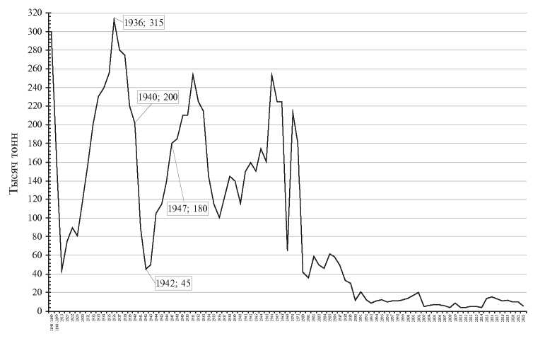 Во-первых, в период Великой Отечественной войны резко сократился промысел в бассейнах Азовского (рис. 3), Чёрного и Баренцева морей. Одновременно значительно увеличился промысловый пресс на водные биоресурсы Каспийского моря и внутренние водоёмы Сибири [18]. Если в предвоенные годы на Каспии за сезон обычно добывали около 250−300 тыс. т воблы (рис. 4) и около 70 тыс. т сельди (рис. 5), то в 1941−1946 гг. объёмы их добычи возросли, соответственно, до 350−450 тыс. т и 130−155 тыс. т [2, 19−22]. Как следствие, запасы этих и некоторых других значимых промысловых видов существенно сократились [23]. Добычу осетровых рыб в военные годы, напротив, снизили примерно в 4−8 раз, по сравнению со смежными предвоенным и послевоенным периодами [22, 24]. Увеличение объёмов рыбопродукции достигалось за счёт преимущественного освоения массовых и относительно менее ценных промысловых объектов.