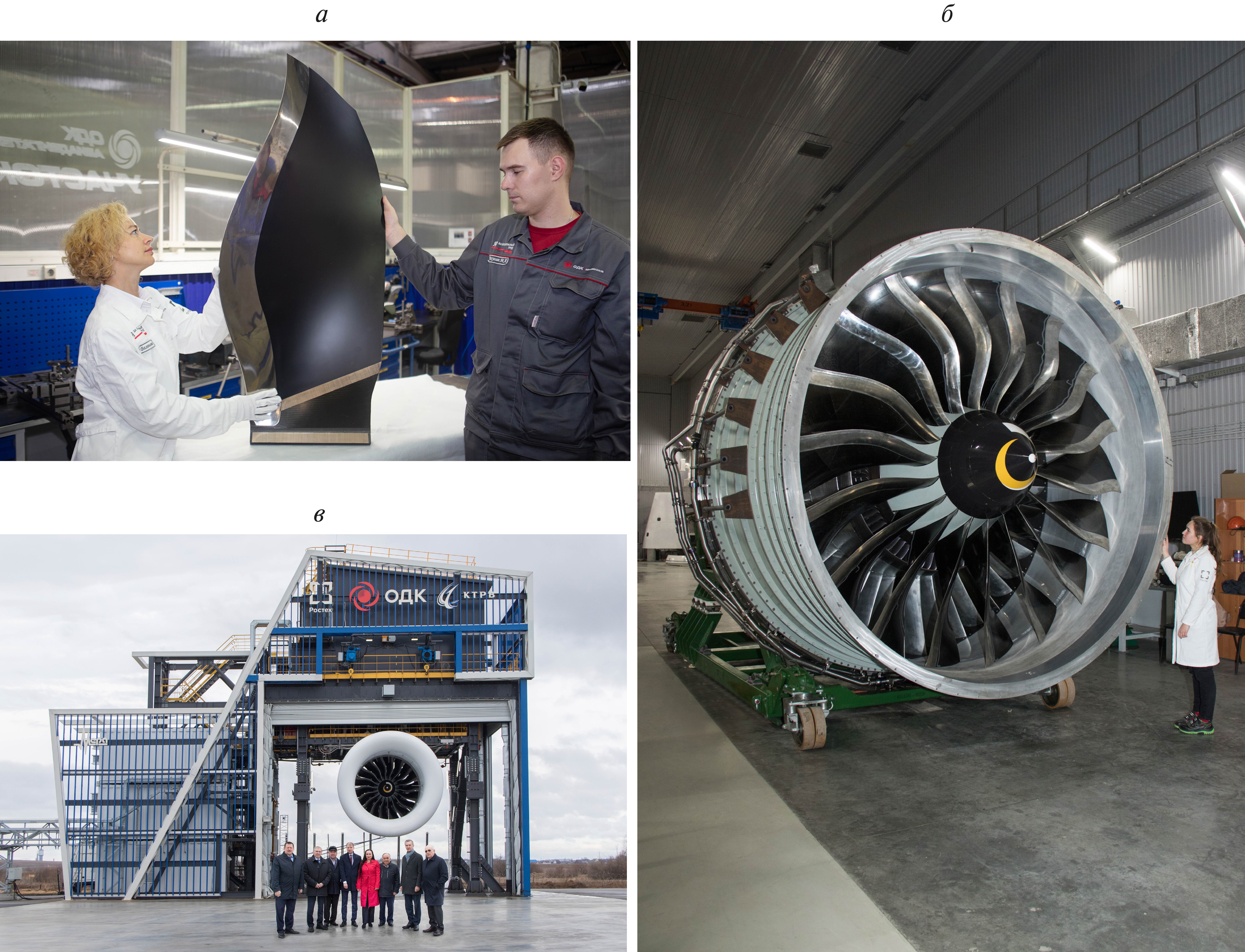 Работы по созданию технологий двигателей большой тяги стартовали в 2018 г. С 2021 г. проводятся испытания газогенератора-демонстратора ПД-35. Первые испытания полноразмерного двигателя-демонстратора технологий ПД-35 (рис. 2 б) начались в АО “ОДК-Авиадвигатель” в феврале 2024 г. В апреле 2024 г. достигнута проектная взлётная тяга 35 тс. Для испытаний семейства таких двигателей в пригороде Перми сооружён уникальный испытательный стенд открытого типа, не имеющий аналогов в России, Евросоюзе и странах Азии (рис. 2 в).